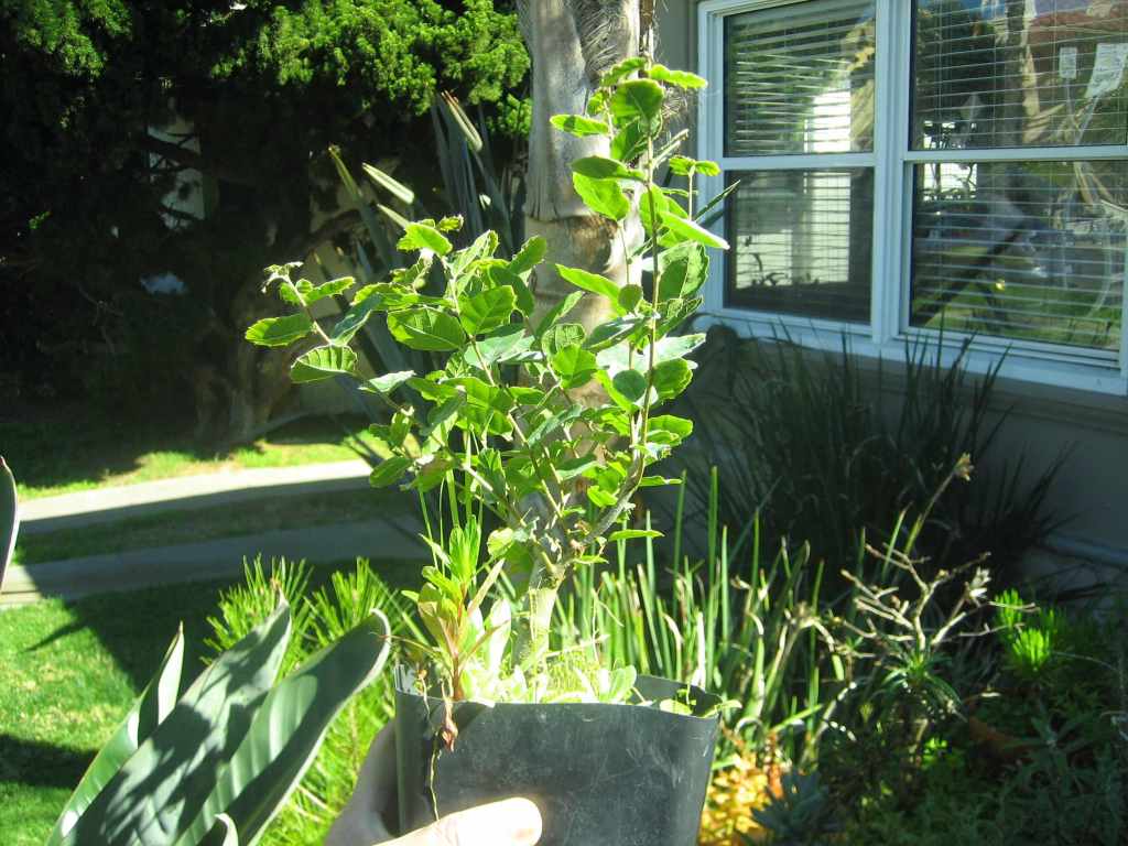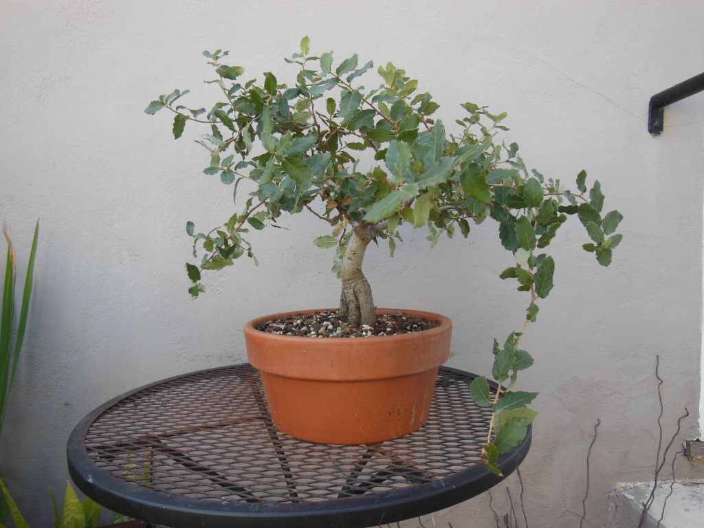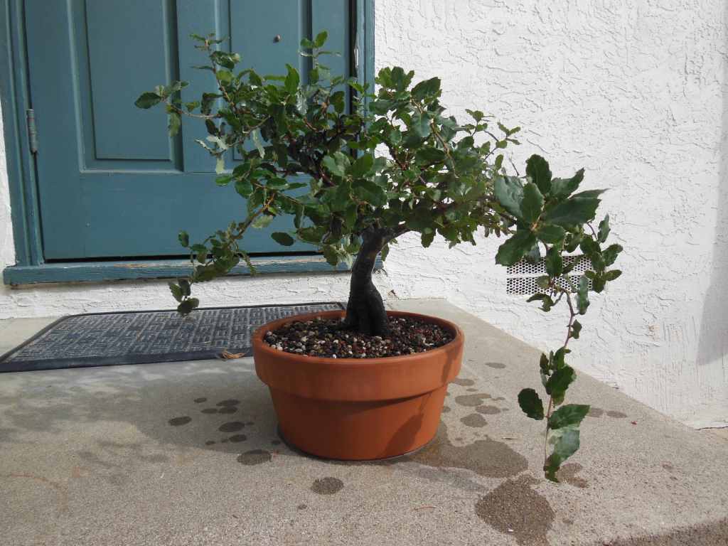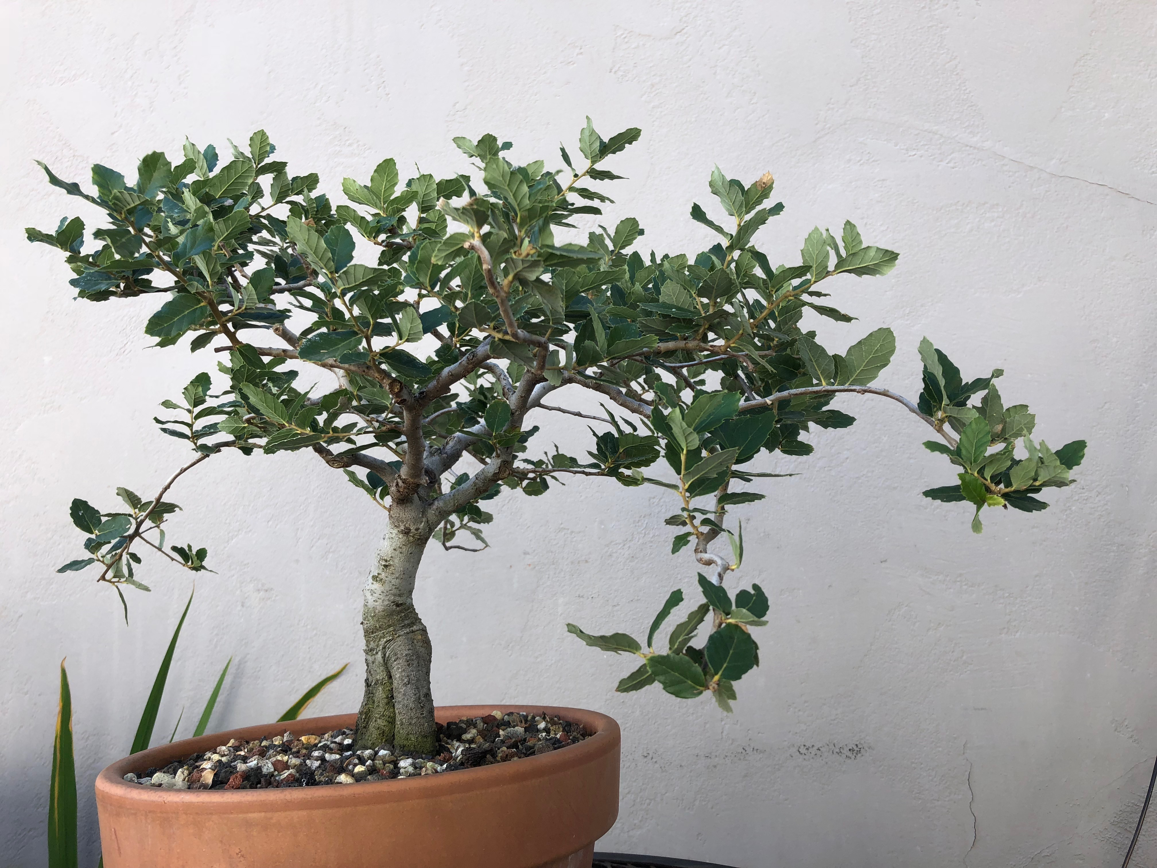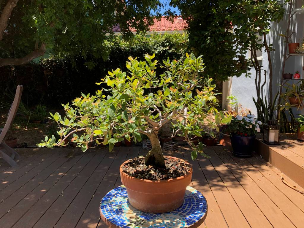 Coast live oak is ubiquitous in the canyons and foothills of southern California, providing food (acorns) and habitat for wildlife. In nature oaks often take a “fountain” formation, with main branches emerging upwards from the trunk and then bending downwards at the branch ends. That is the ultimate design goal for this tree, although it isn’t there yet.