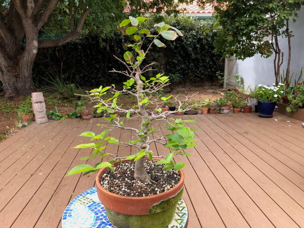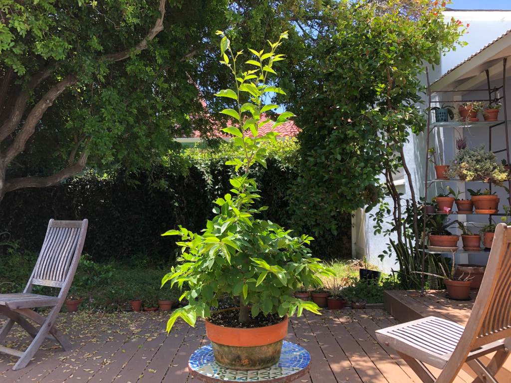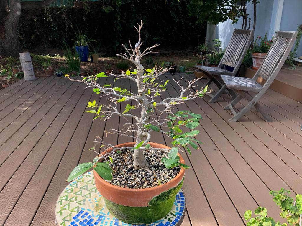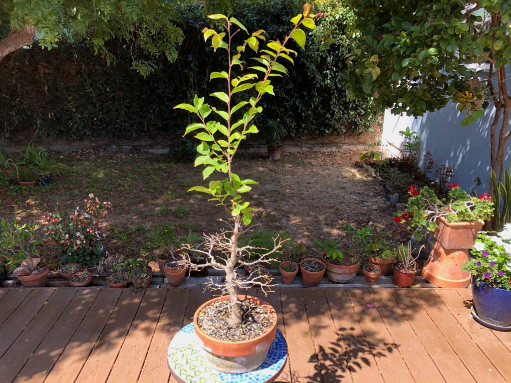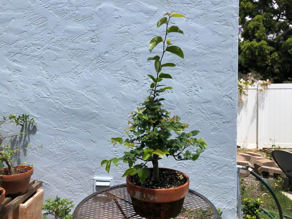 The tree after two years. The first several years the tree lost leaves in early summer and had a second flush in mid-summer. I think this was because I didn’t water enough in spring.