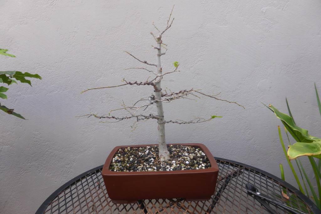 The tree in spring a year and a half ago with sacrifice branches to thicken the trunk and nebari.