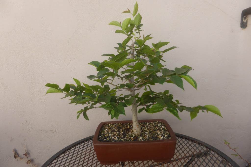Different hackberry species are found throughout the world. This one is an American variety, native to the eastern U.S. and Canada. It was purchased May, 2013 from Kuma Bonsai, San Diego. The fruits of this tree are edible and nutritious. They were an important food item for native Americans.