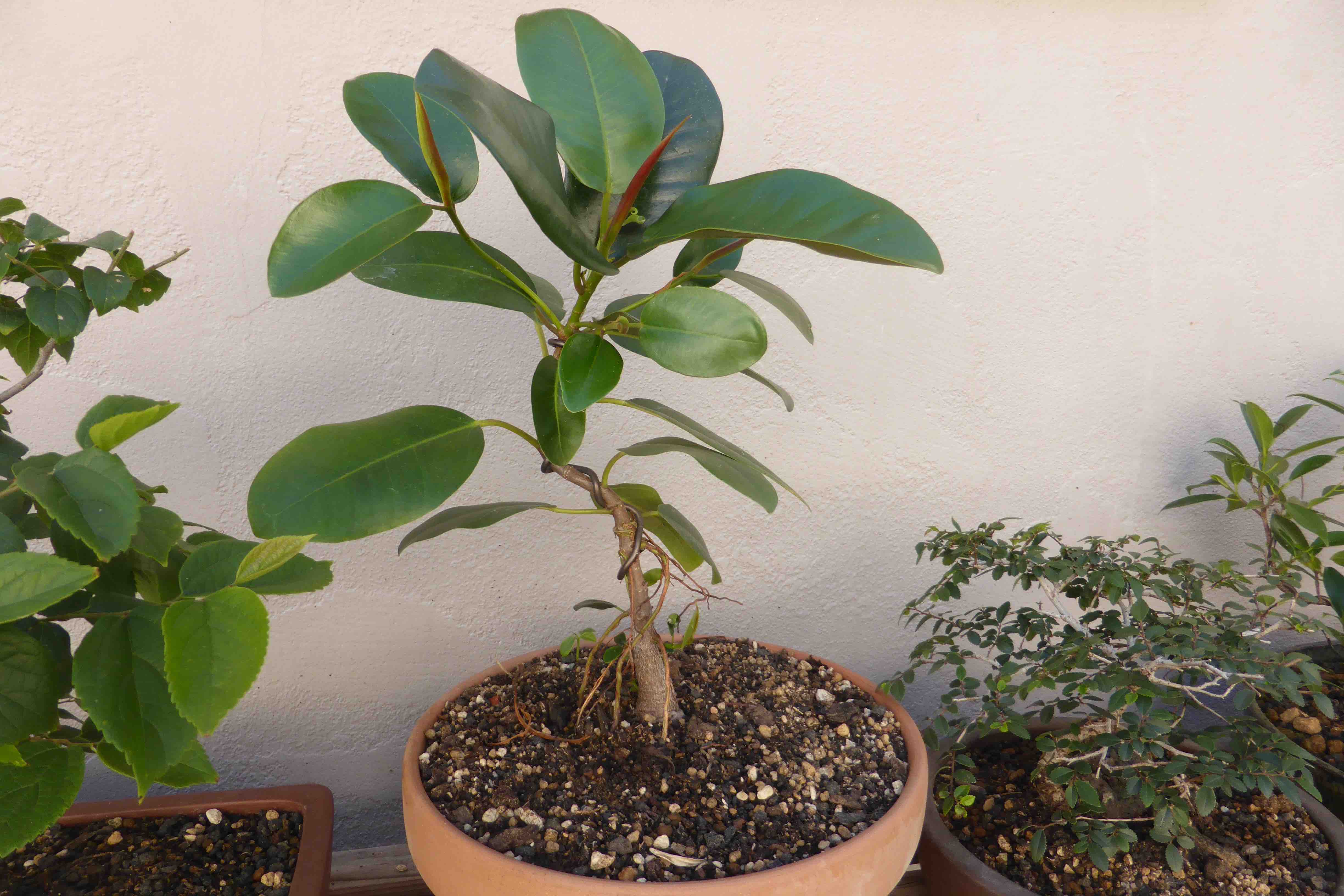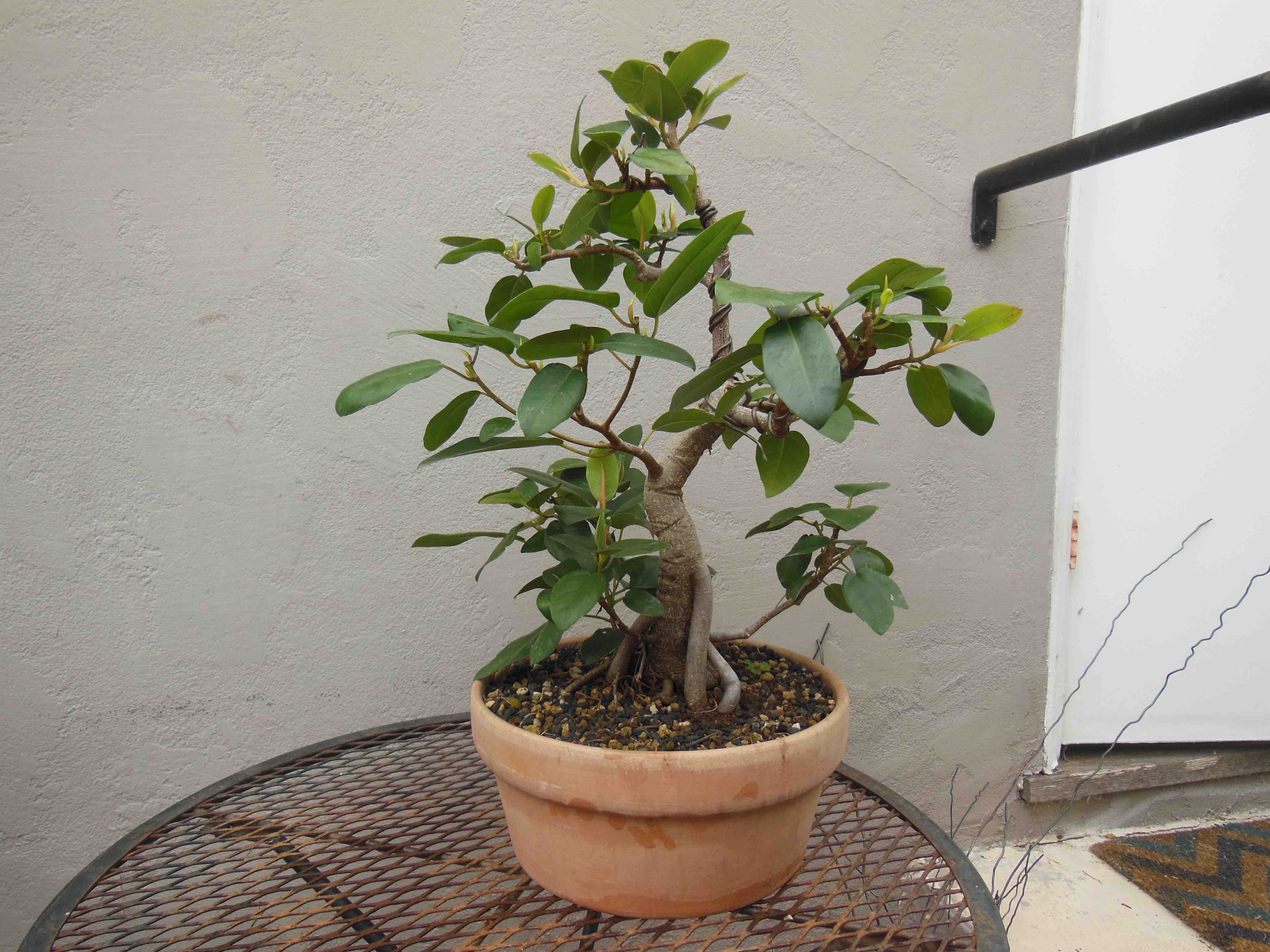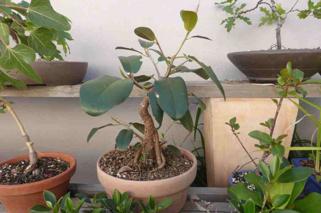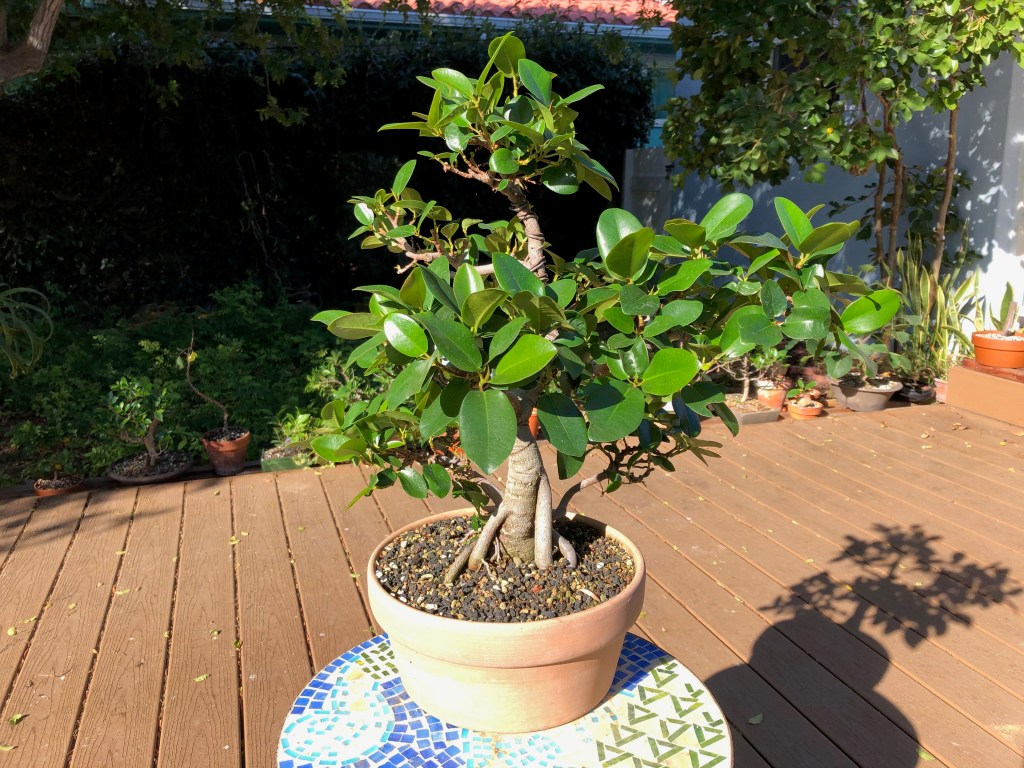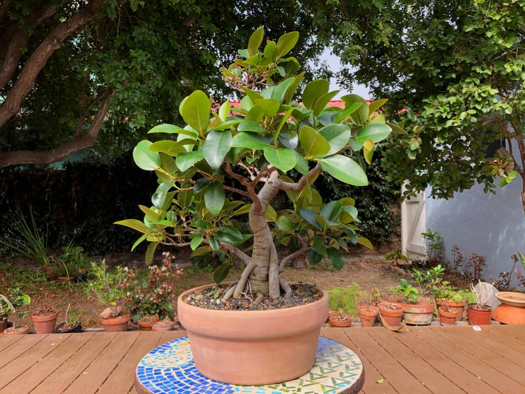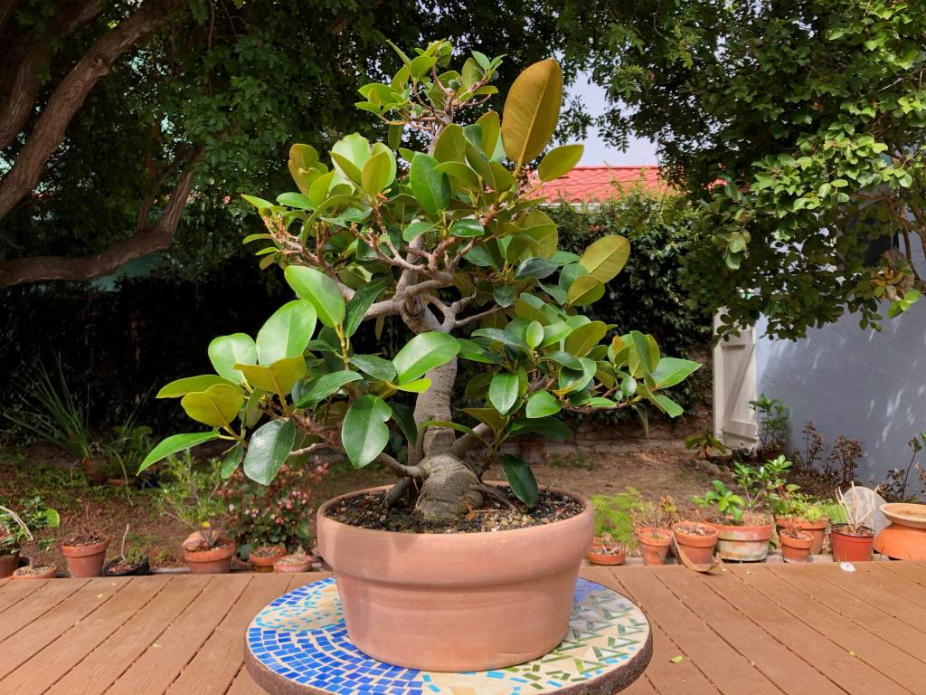 The Port Jackson fig, also known as the “rusty-leaf fig” (Ficus rubiginosa) is a banyon ficus that is a commonly used species for bonsai. It readily forms aerial roots in warm and humid conditions. This tree was purchased from Walter Anderson nursery in San Diego on January 5, 2015. After two weeks it was slip-potted into a large container with a mixture of old sifted and unsifted bonsai soil, new akadama, black scoria, and worm castings.