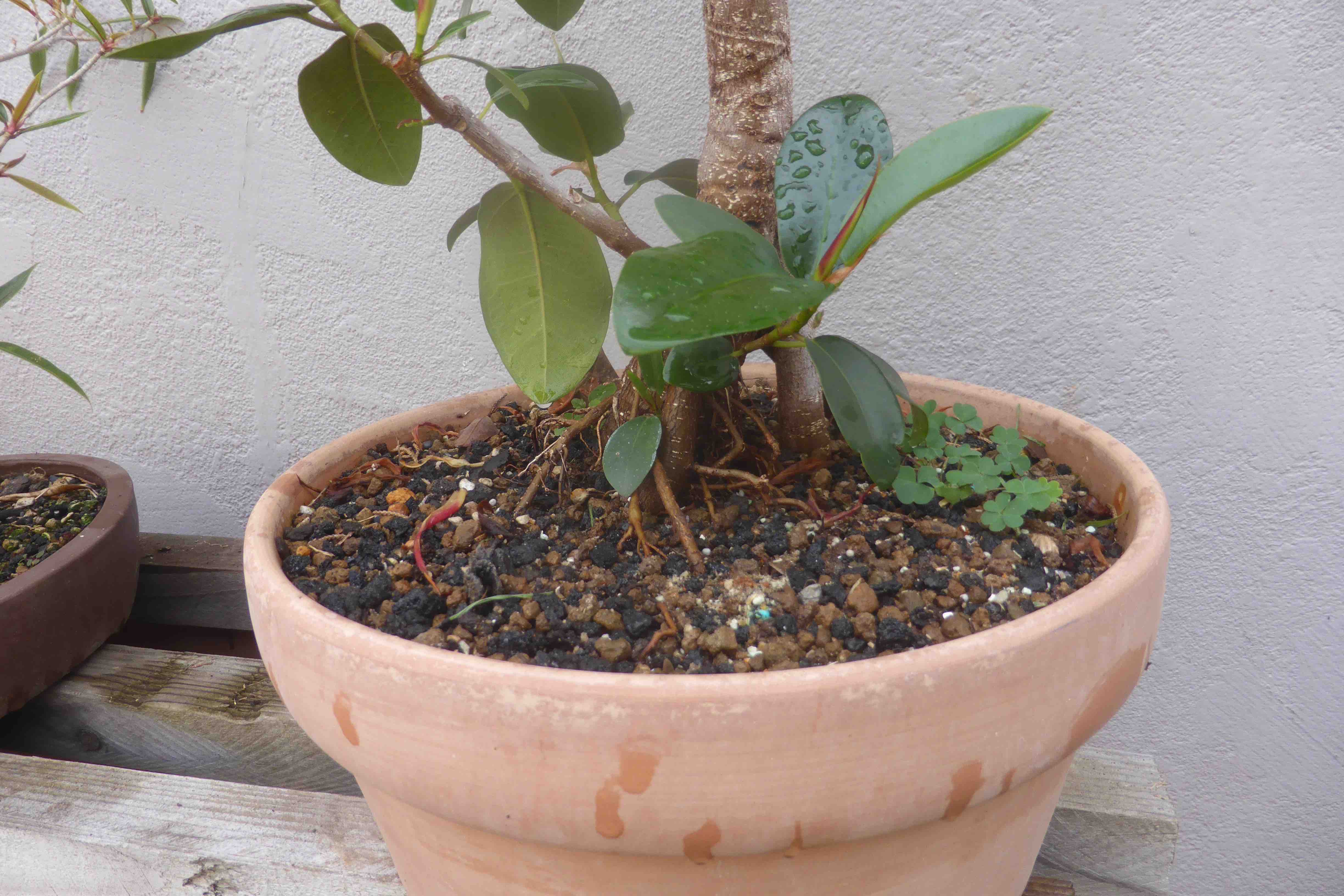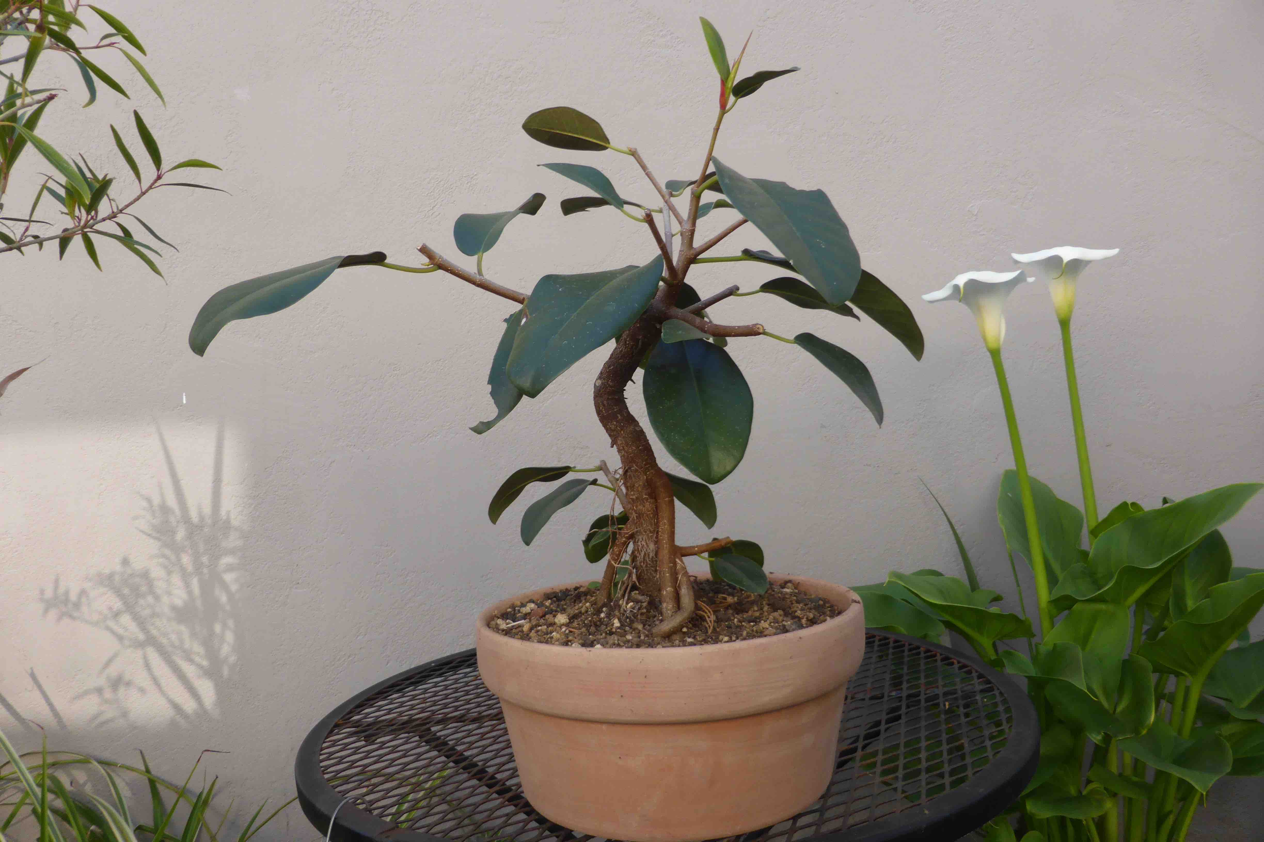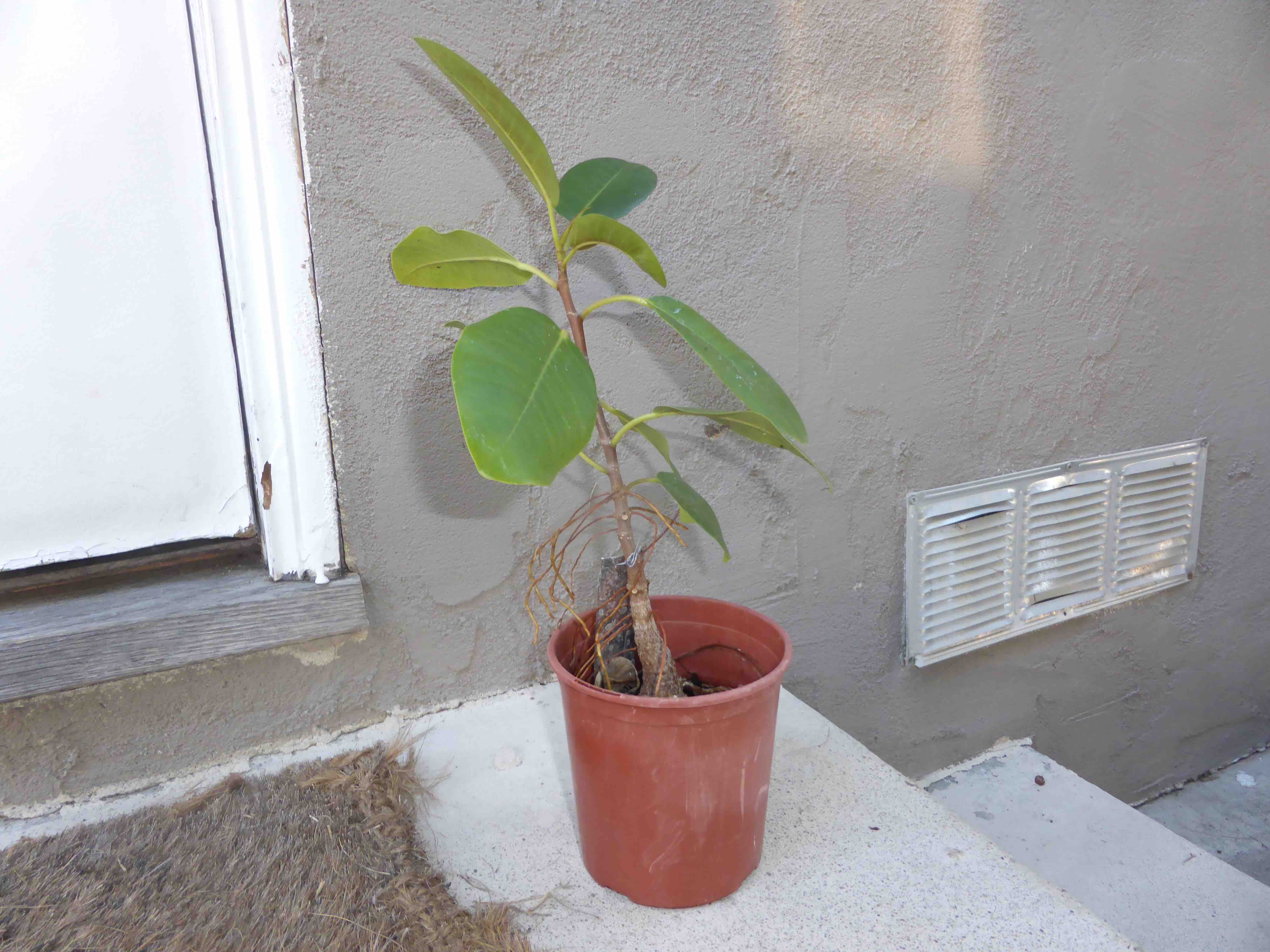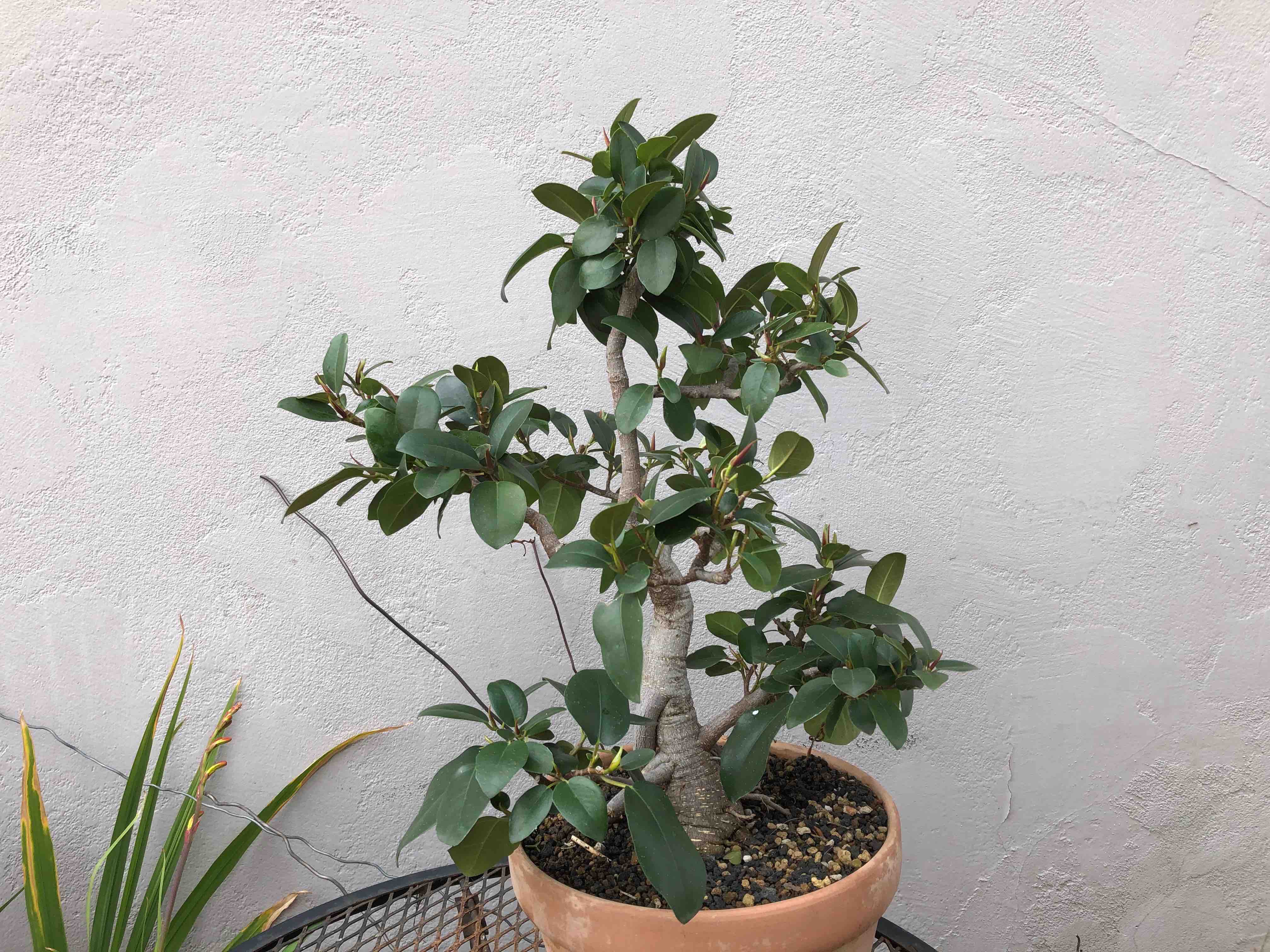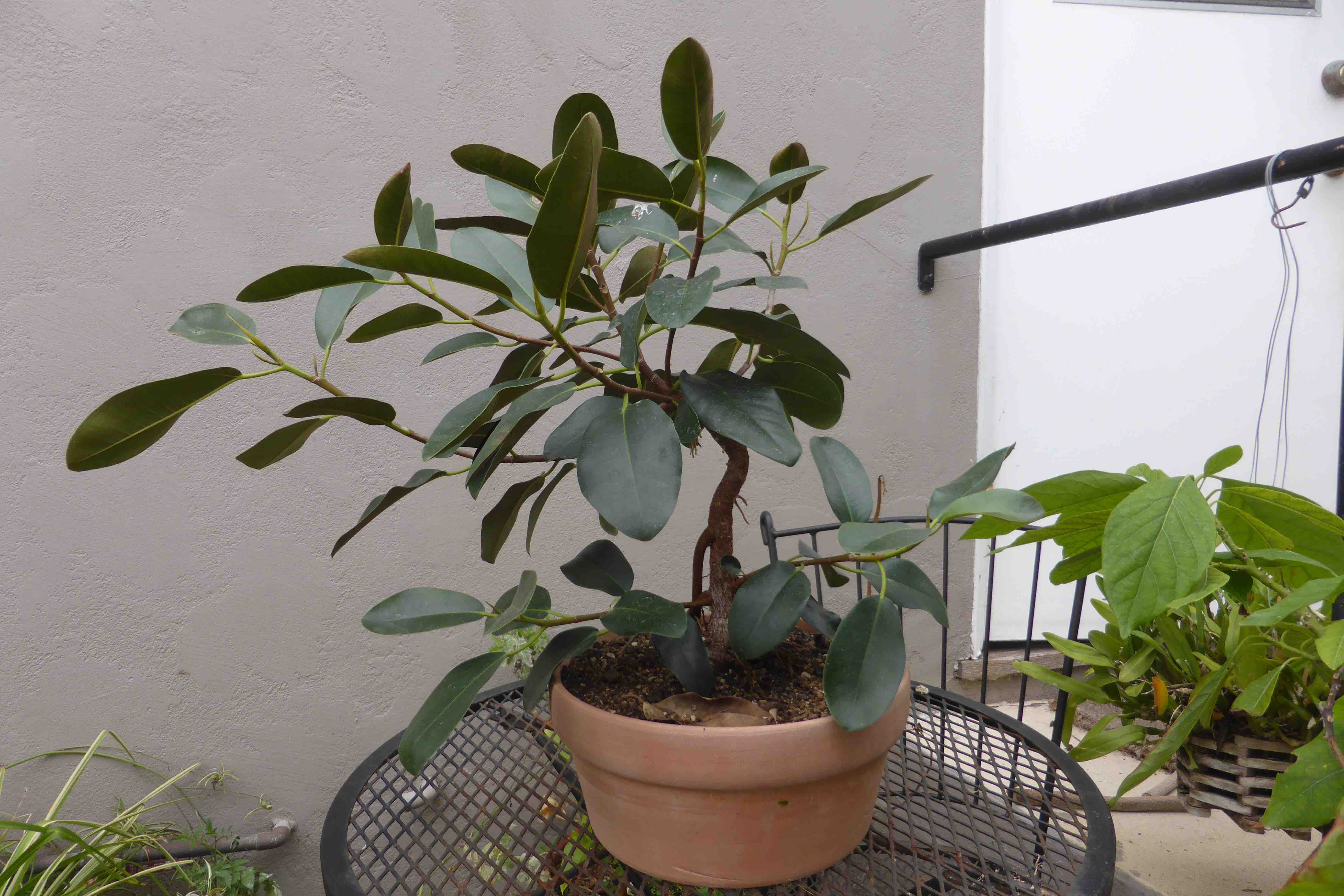 The Port Jackson fig, also known as the “rusty-leaf fig” (Ficus rubiginosa) is a banyon ficus that is a commonly used species for bonsai. It readily forms aerial roots in warm and humid conditions. This tree was purchased from Walter Anderson nursery in San Diego on January 5, 2015. After two weeks it was slip-potted into a large container with a mixture of old sifted and unsifted bonsai soil, new akadama, black scoria, and worm castings.