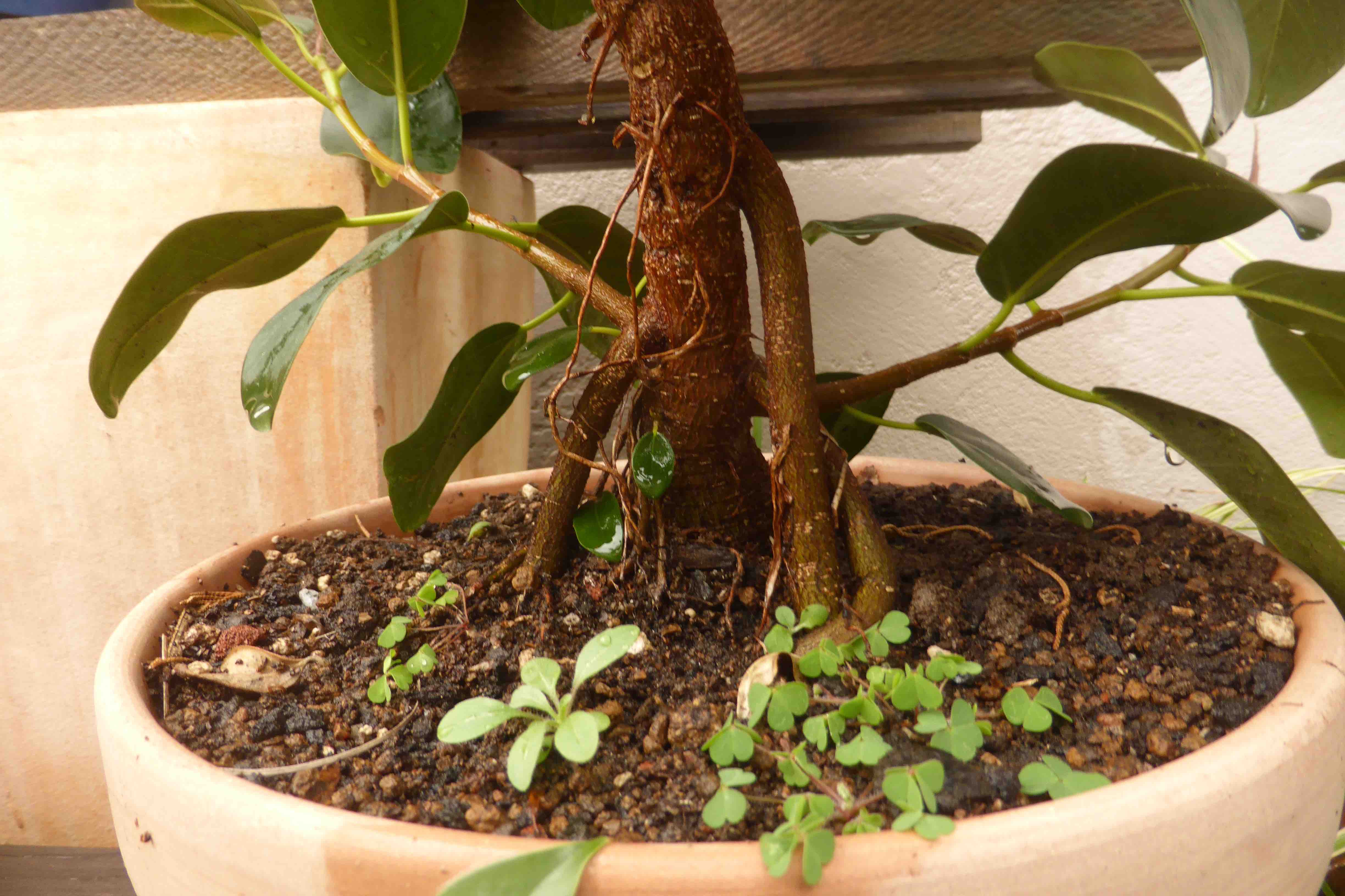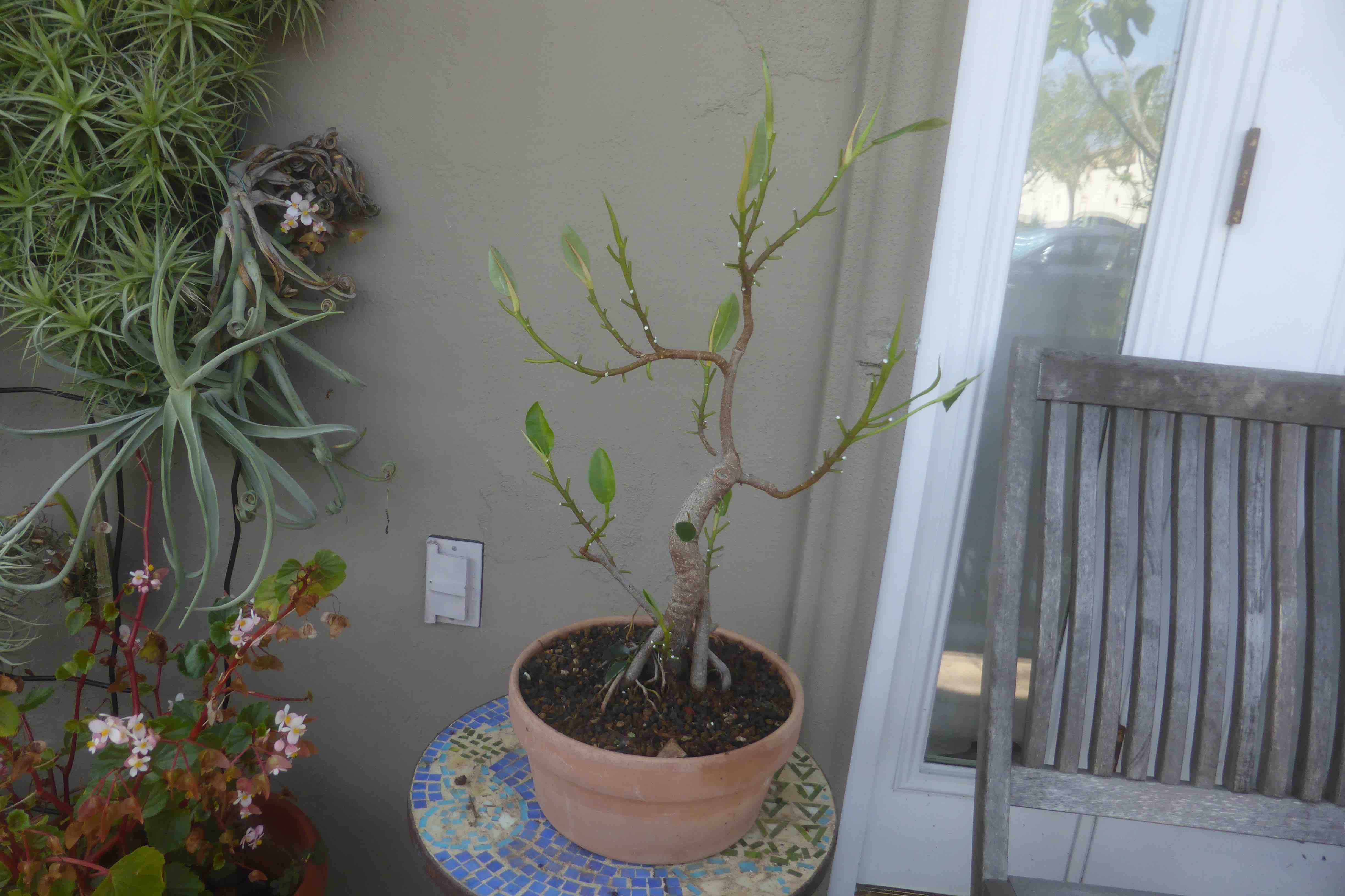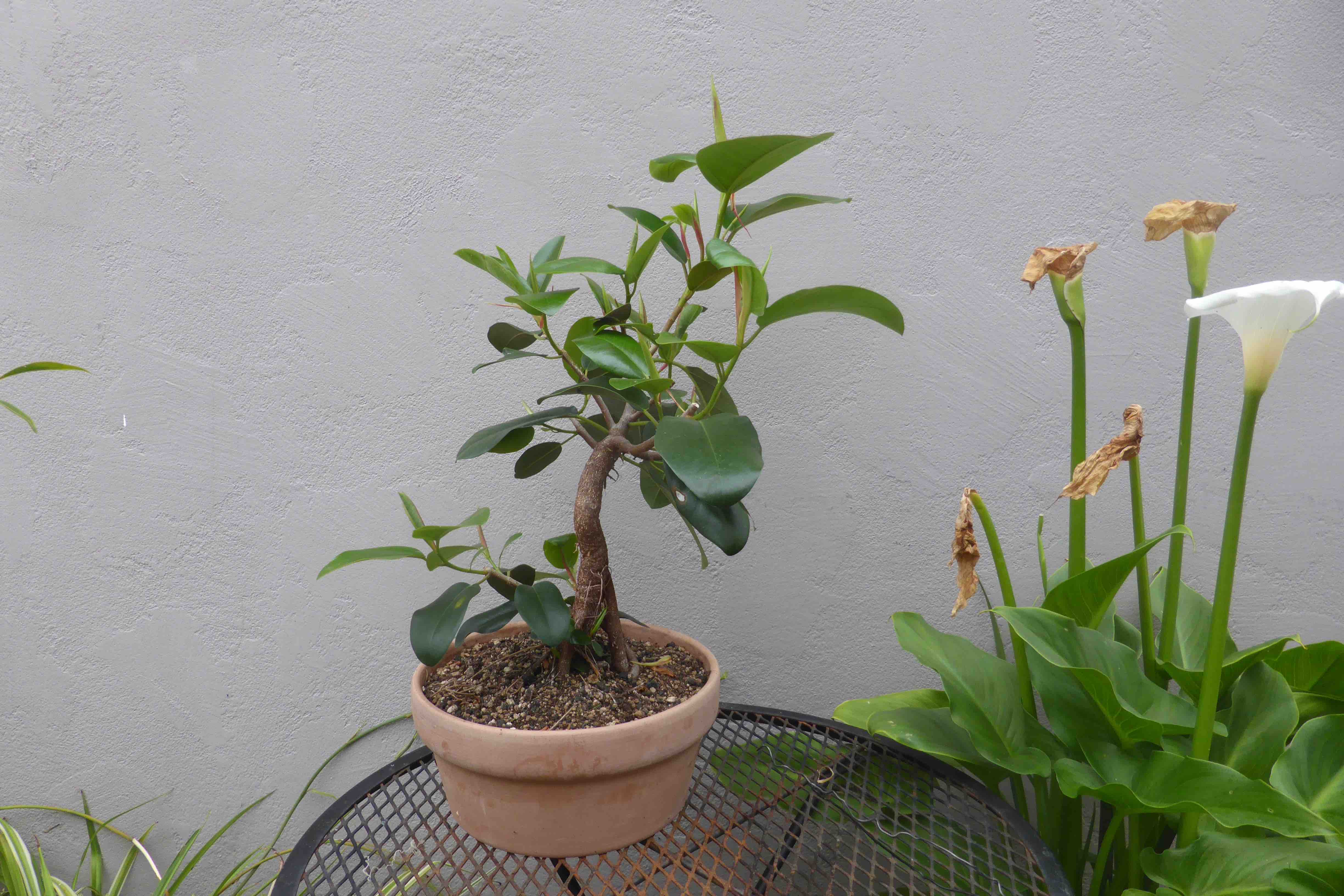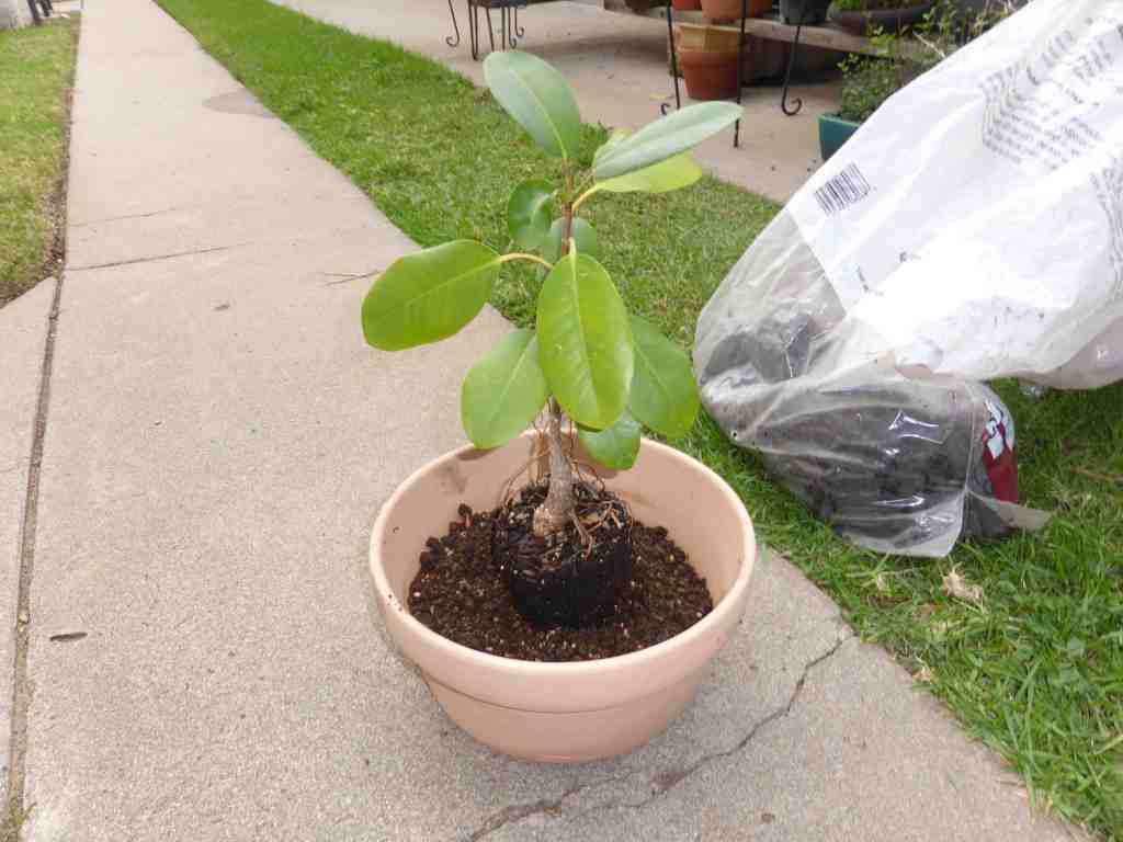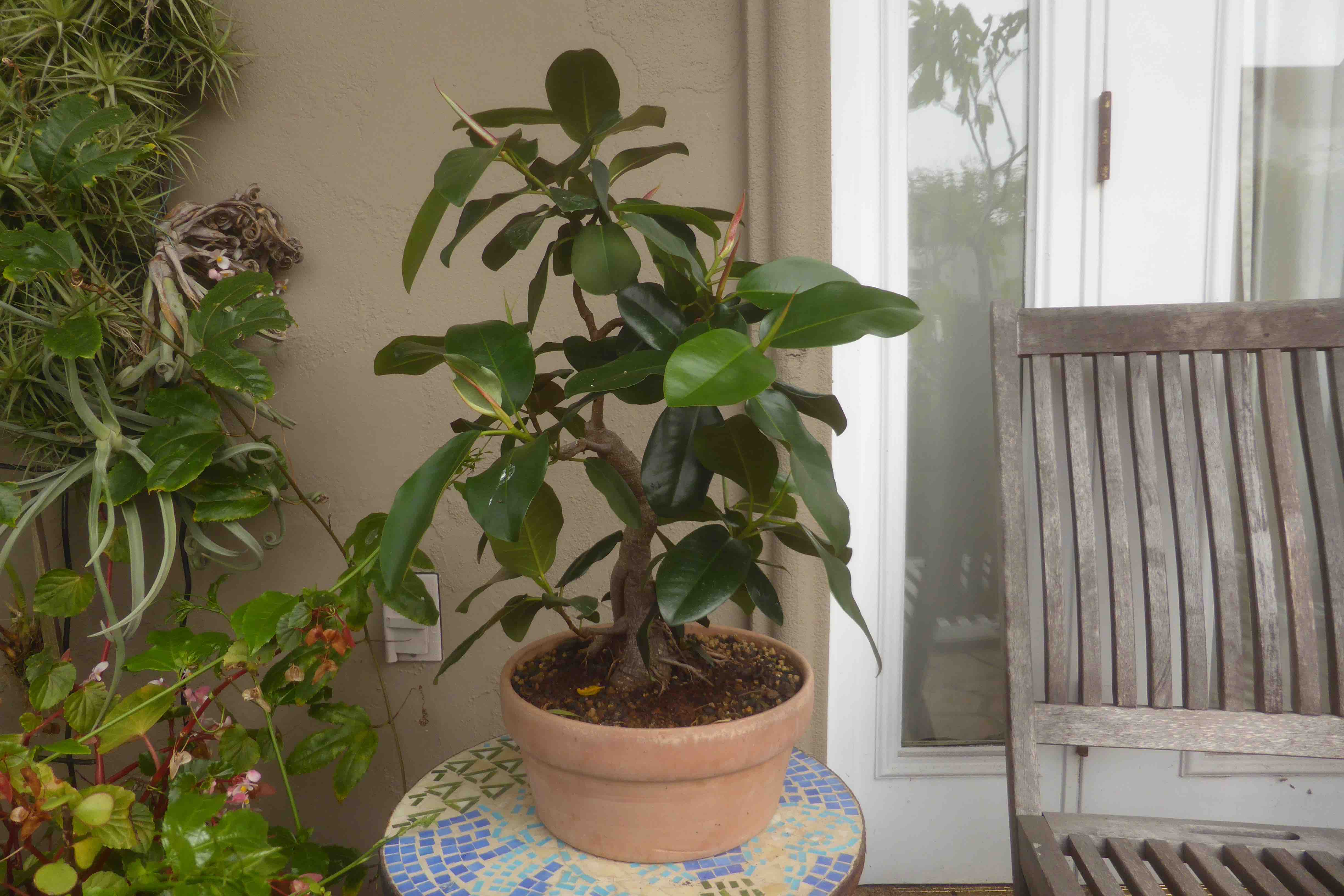 The Port Jackson fig, also known as the “rusty-leaf fig” (Ficus rubiginosa) is a banyon ficus that is a commonly used species for bonsai. It readily forms aerial roots in warm and humid conditions. This tree was purchased from Walter Anderson nursery in San Diego on January 5, 2015. After two weeks it was slip-potted into a large container with a mixture of old sifted and unsifted bonsai soil, new akadama, black scoria, and worm castings.