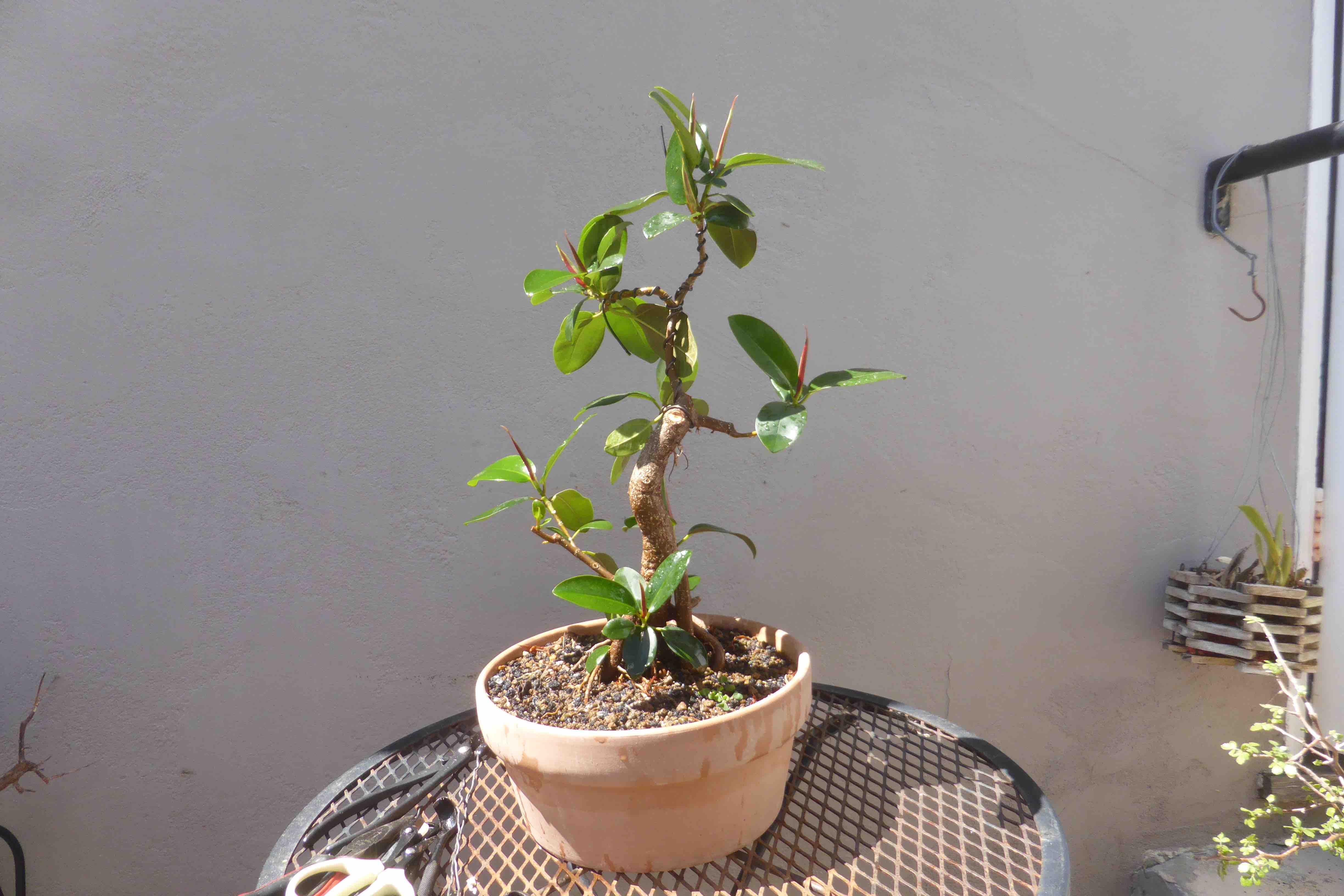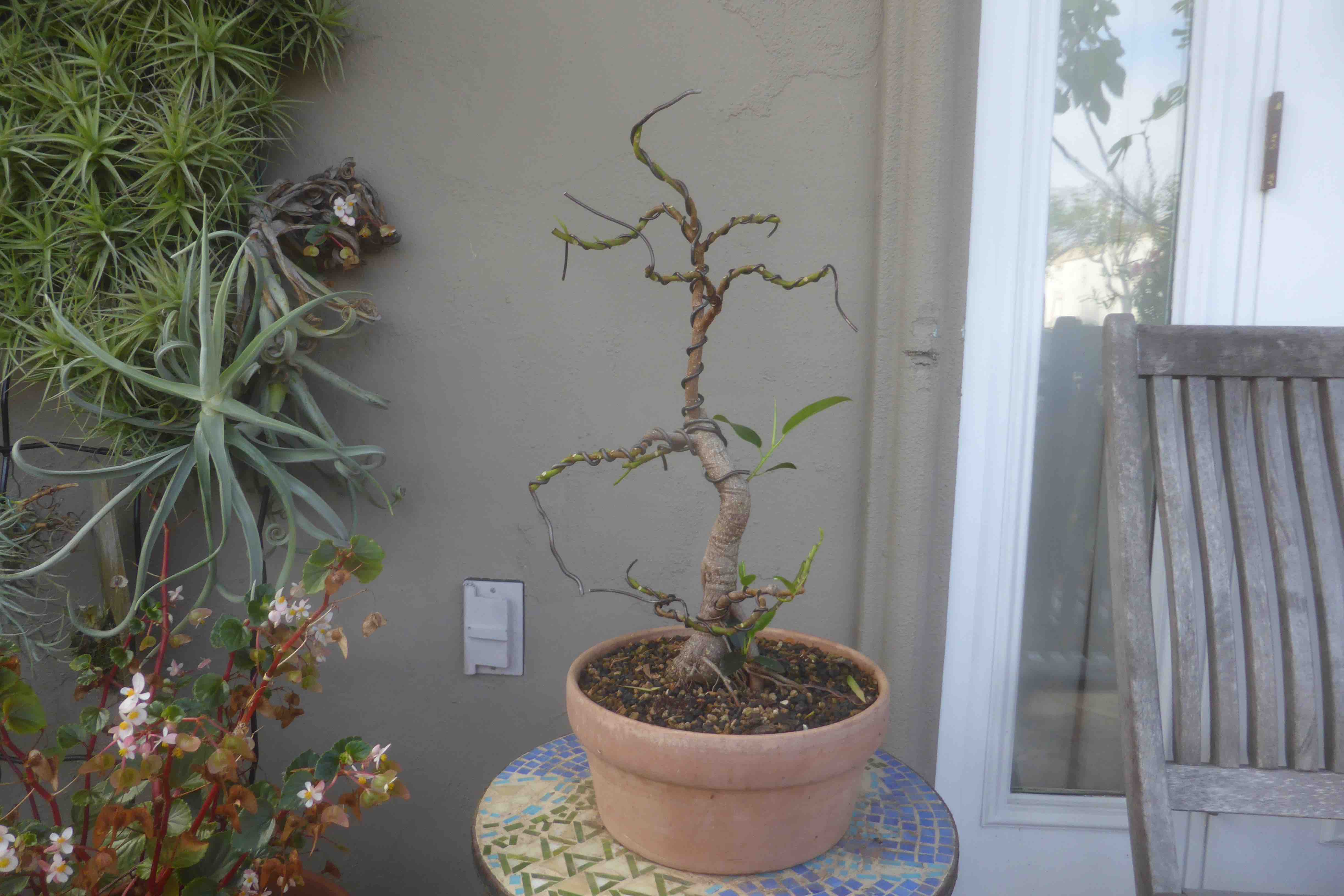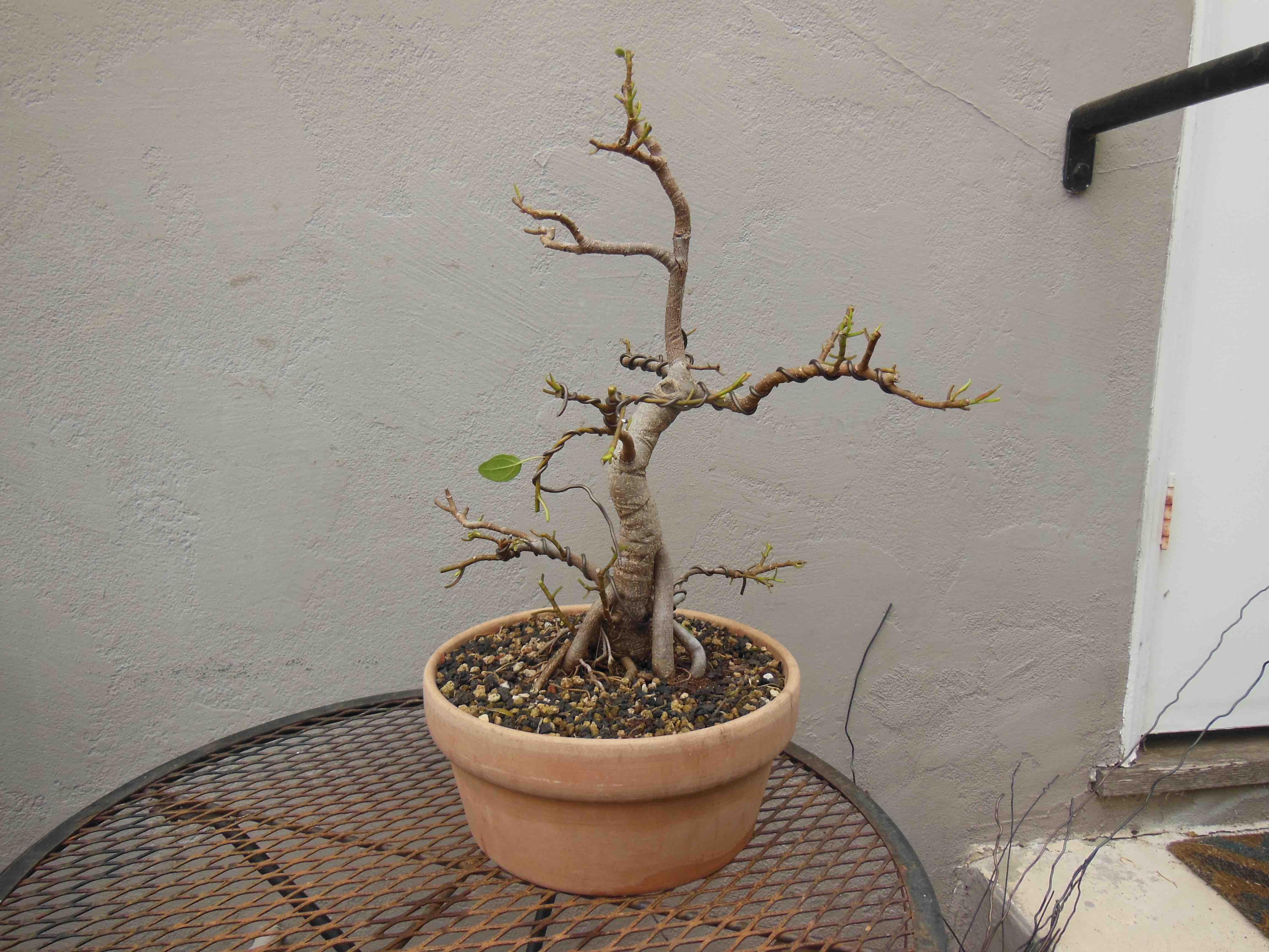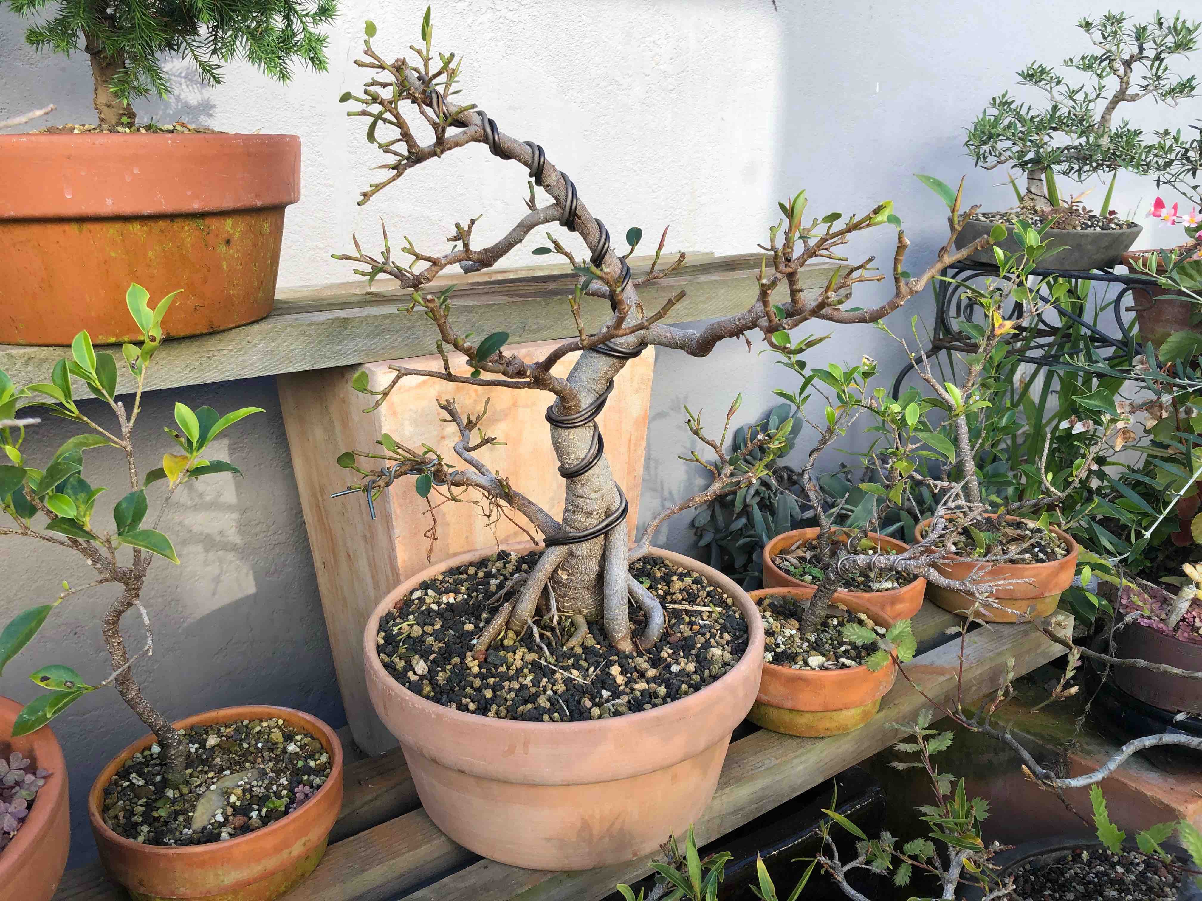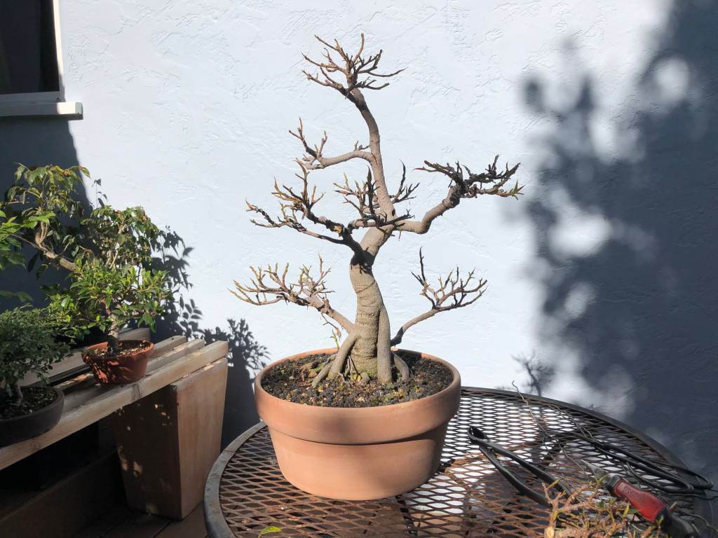 The tree with more trunk-wiring, defoliated and back on the benches. The next steps are to rewire the smaller branches, and try to encourage better aerial root formation from the lowest branches.
