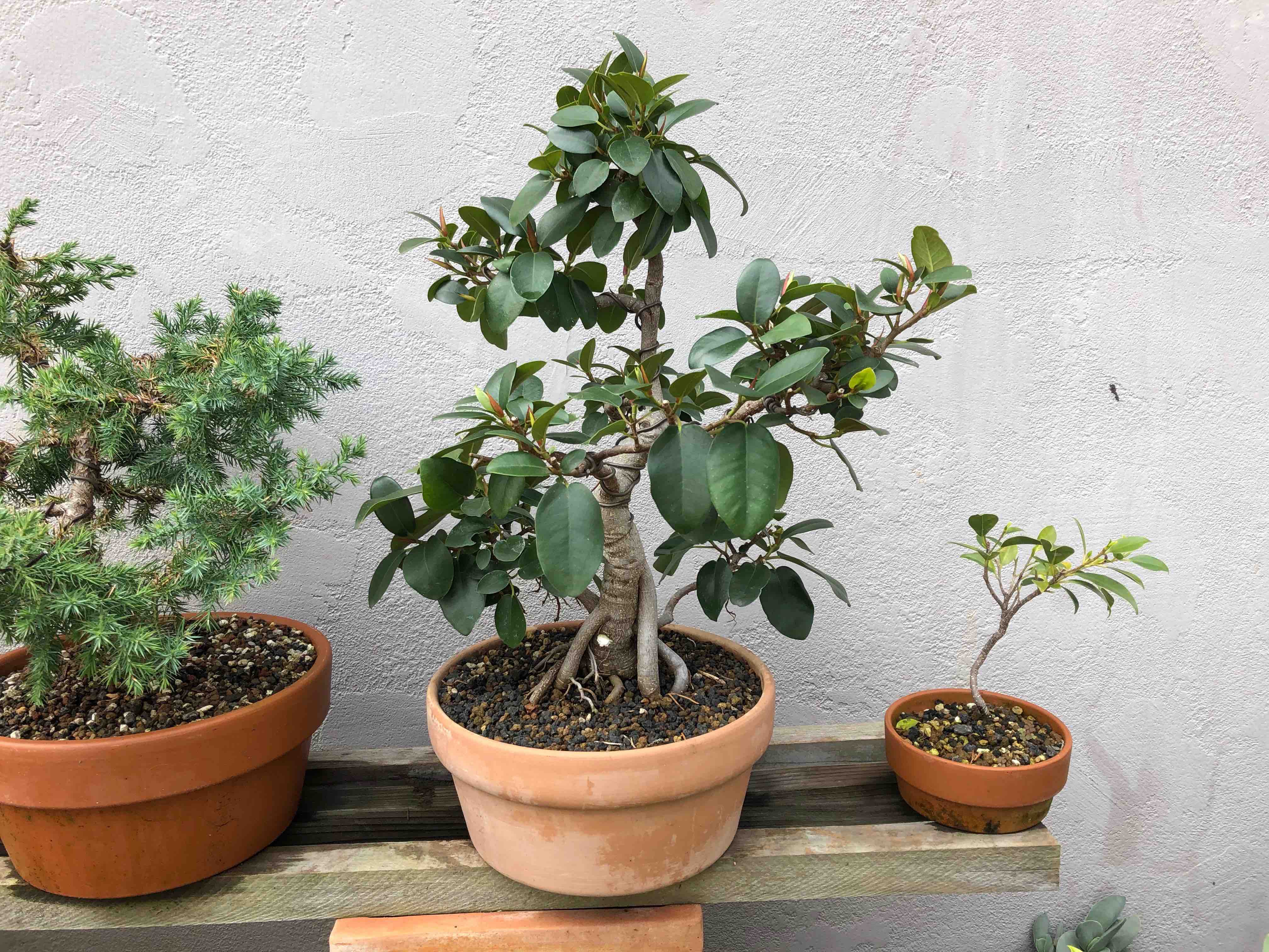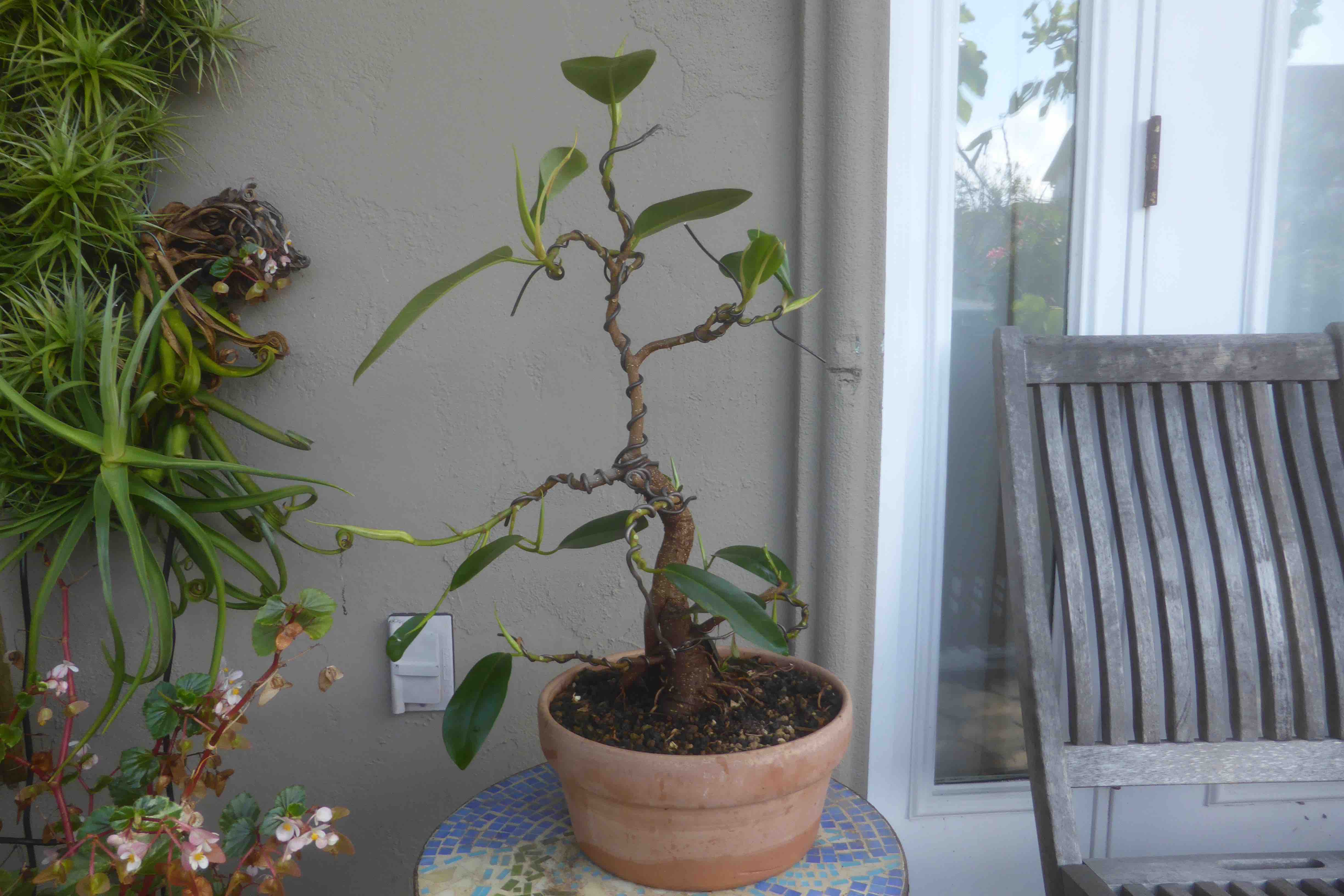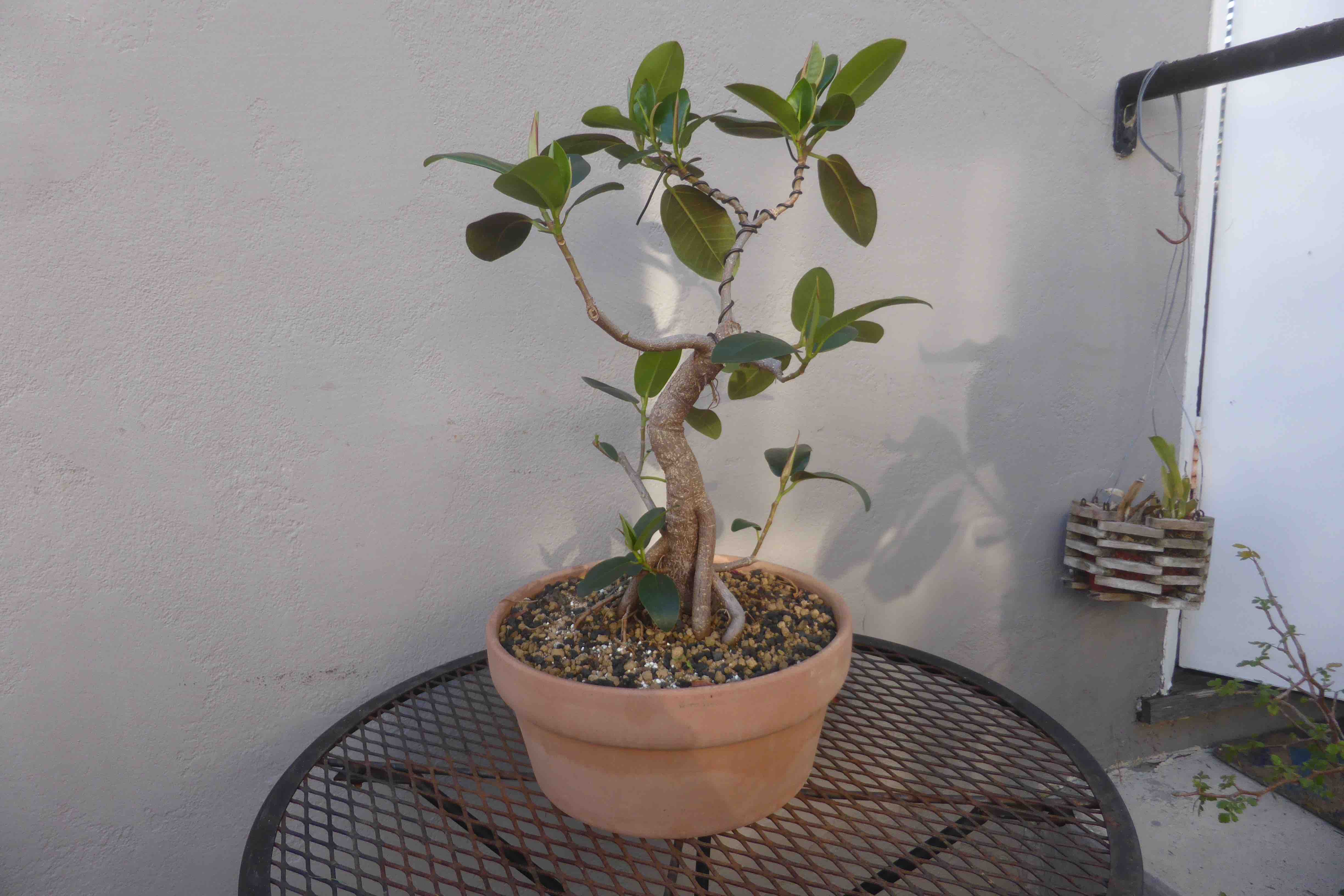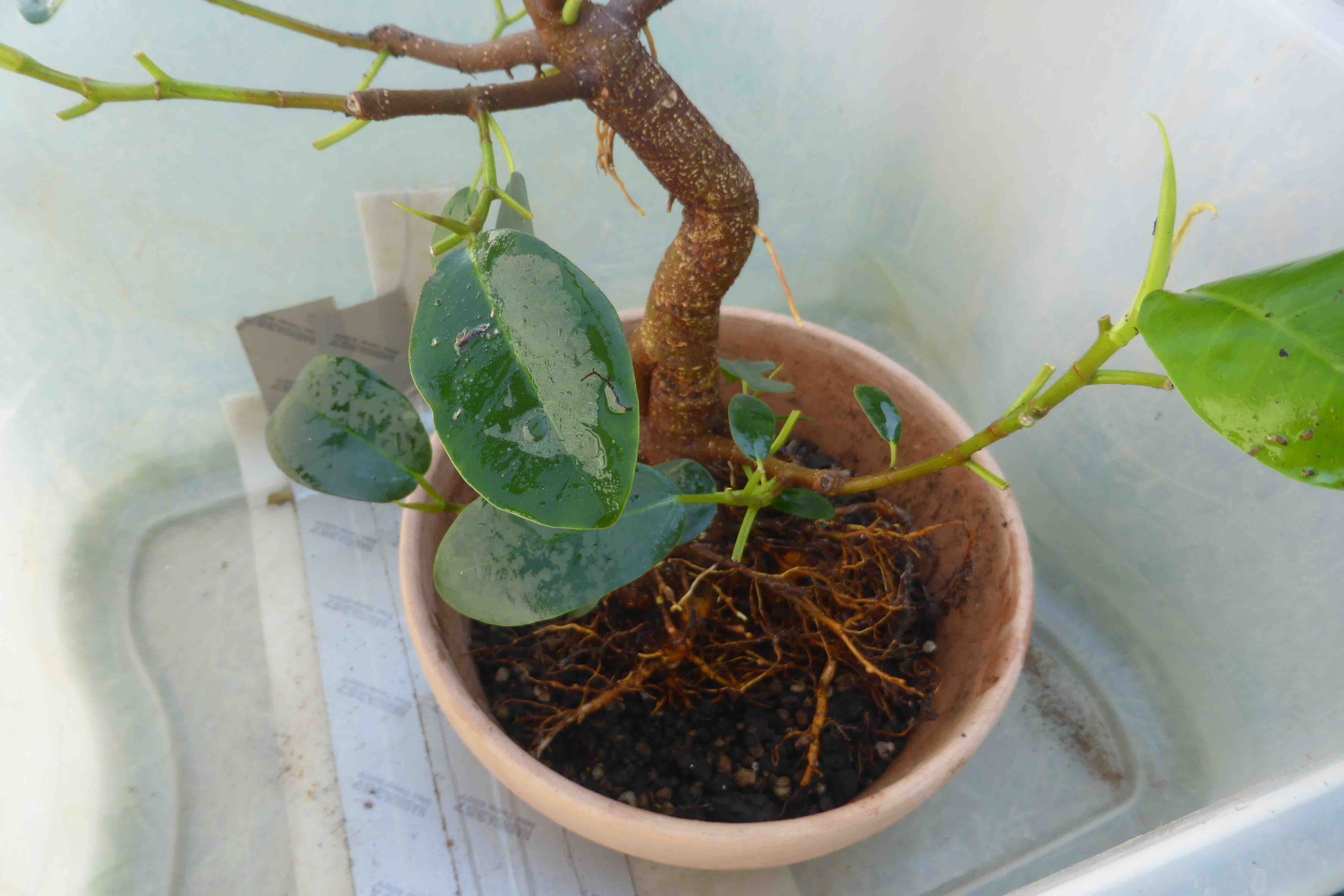 The tree with more trunk-wiring, defoliated and back on the benches. The next steps are to rewire the smaller branches, and try to encourage better aerial root formation from the lowest branches.