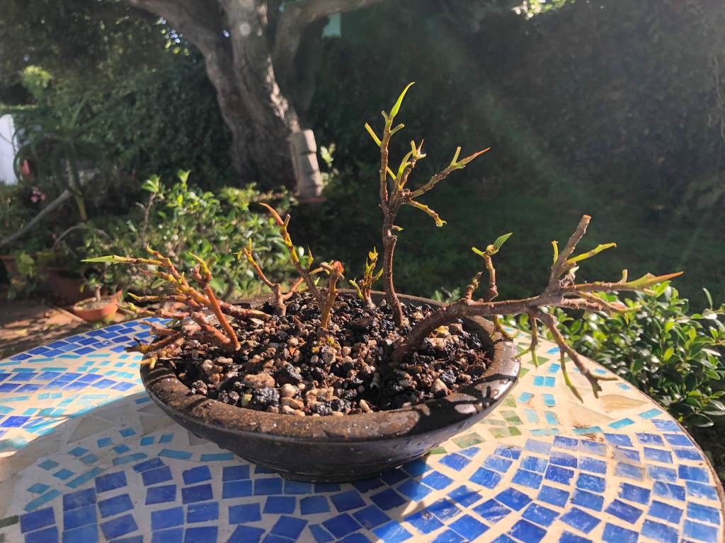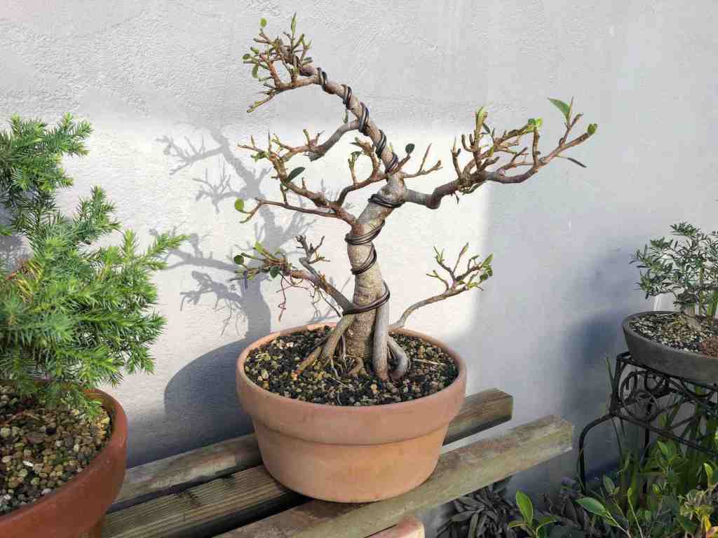 Root- and trunk-pruned, ready for repotting.