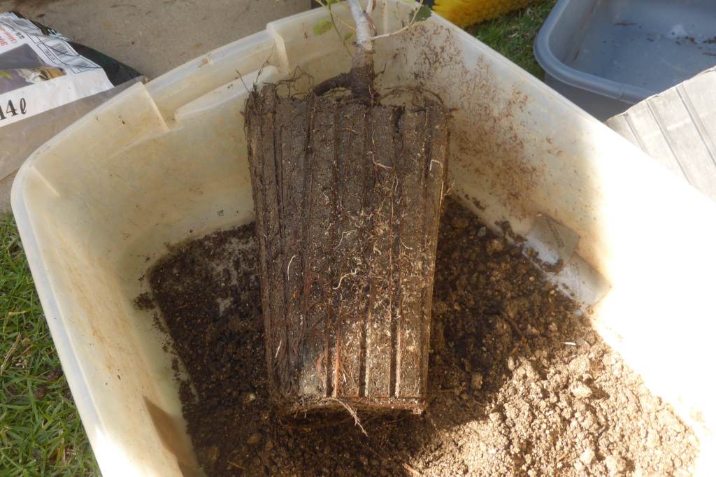 Frequent watering will be critical while the tree establishes new roots. I generally water at least once a day in summer but tried to water more frequently in this case.
