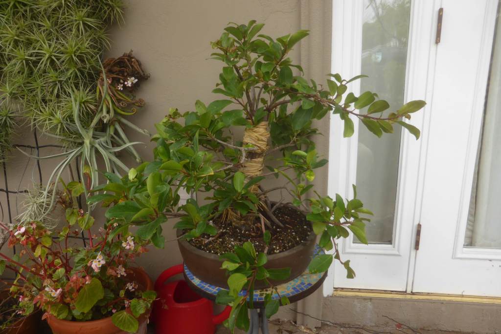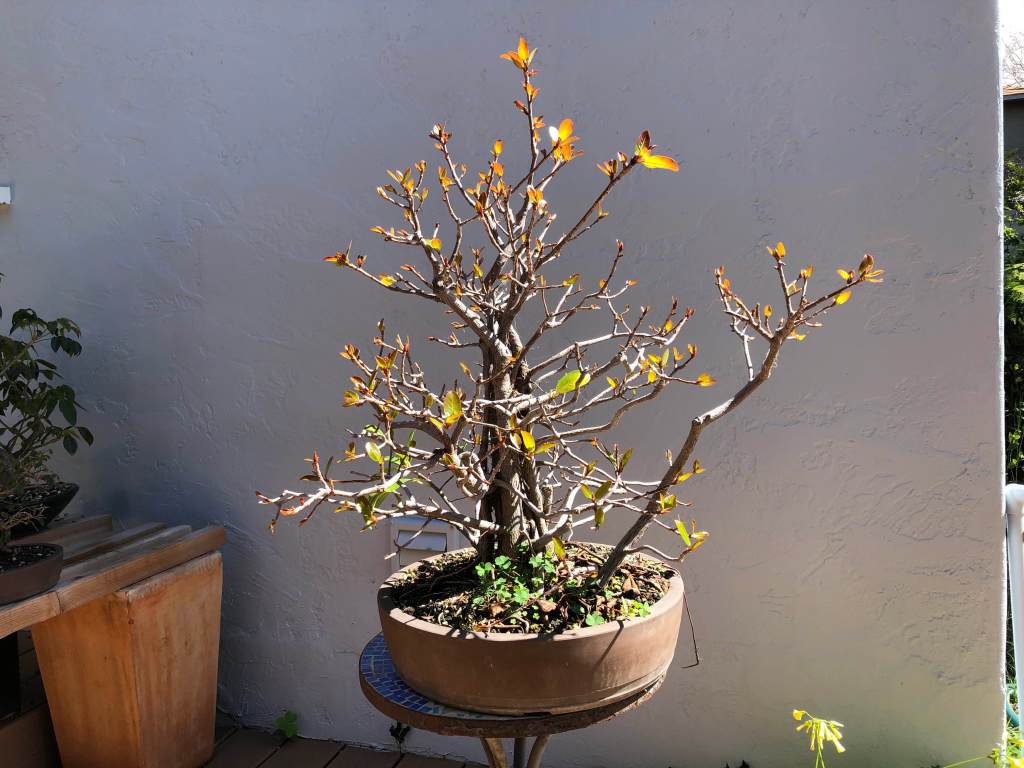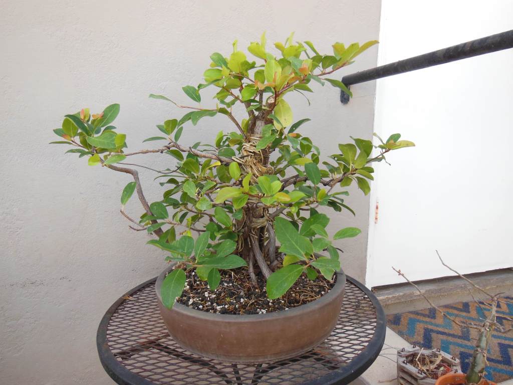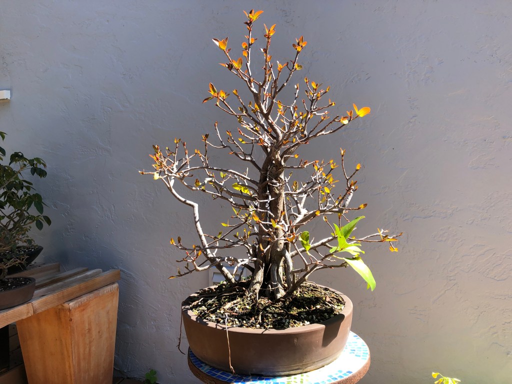 The tree today. Later this spring I will repot the tree and wire the trunks tightly together to try to get them to better fuse into a single trunk.