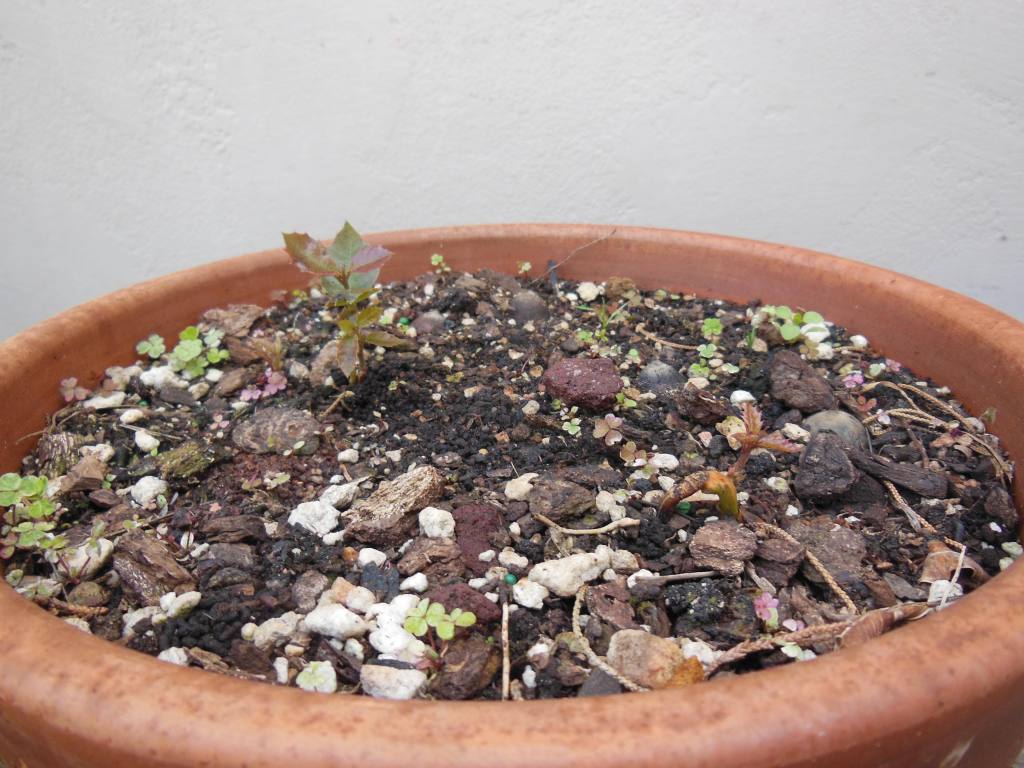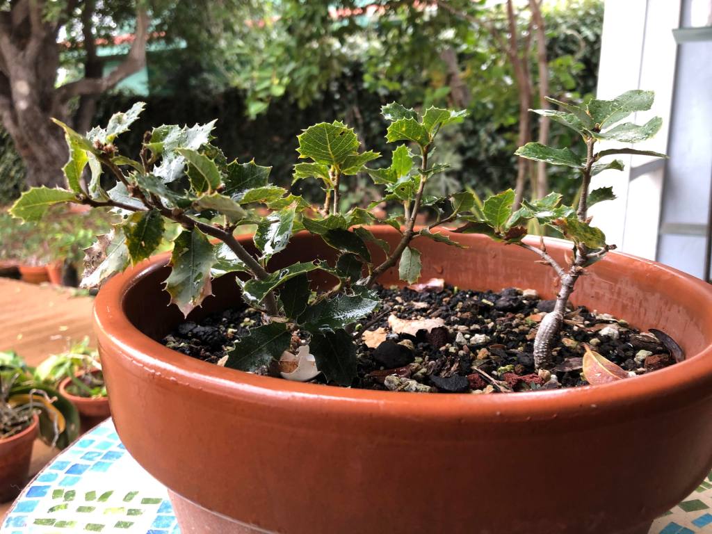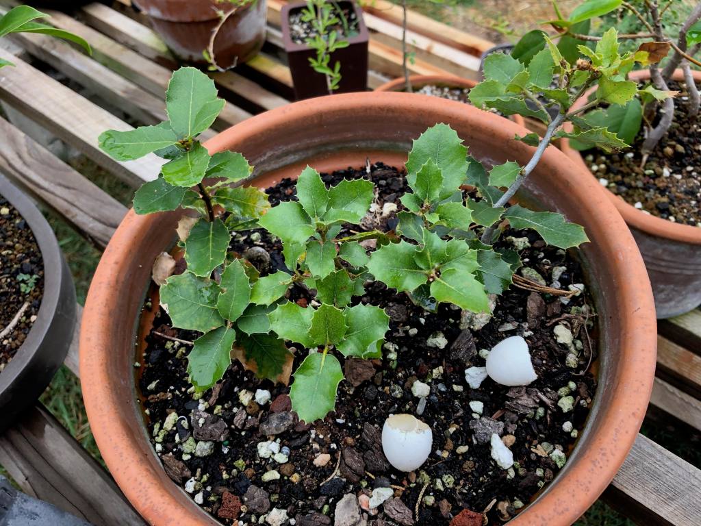 Summer growth on the bonsai benches. The egg shell is probably a