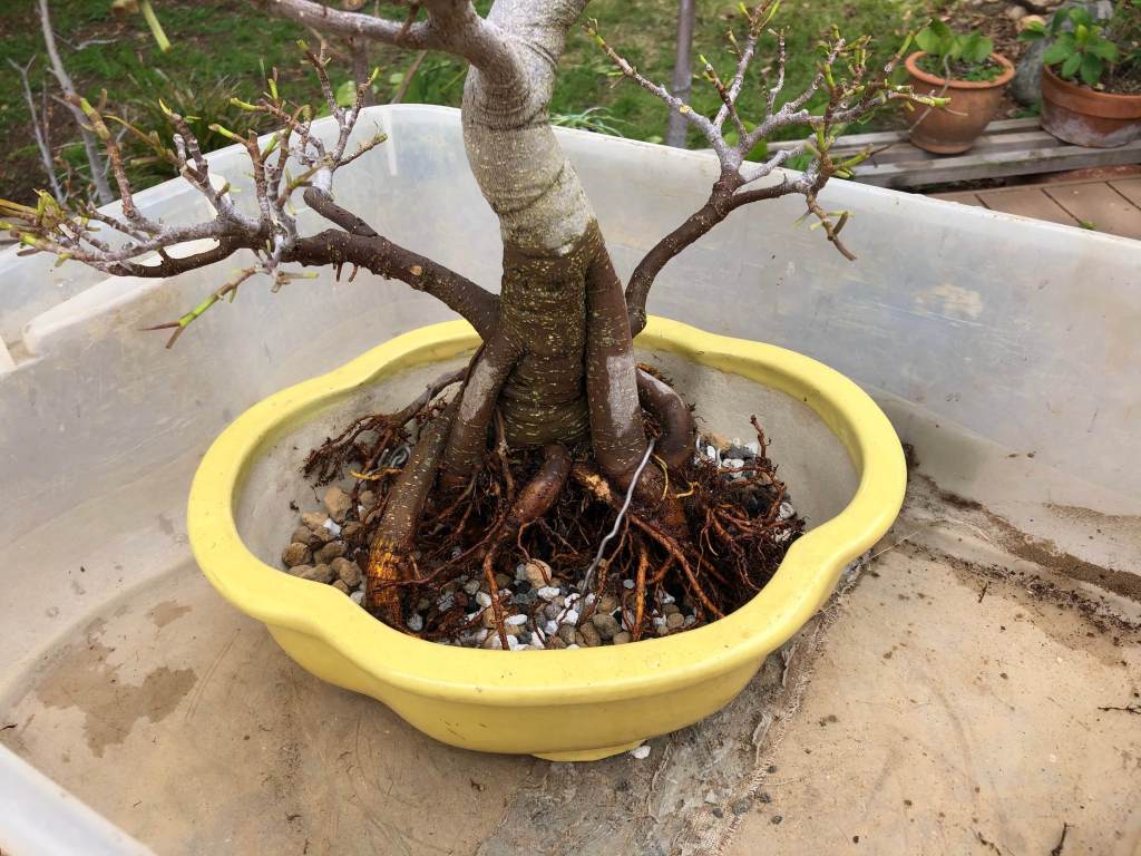 Last weekend I repotted my Port Jackson fig from terra-cotta into a proper Japanese bonsai pot by Koyo. I started developing this tree from a sprig in January, 2015. For a progression of the tree from then to August 2020 see: https://beginbonsai.net/2019/03/31/port-jackson-fig-ficus-rubiginosa/