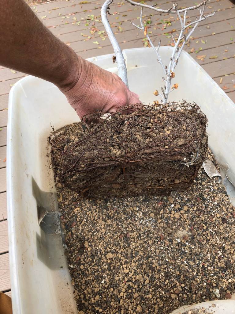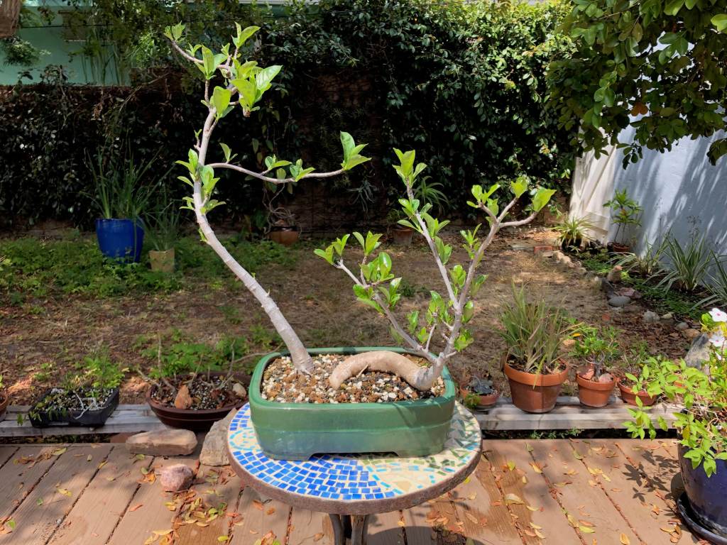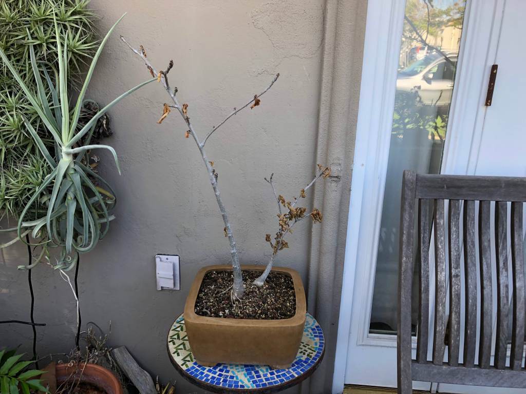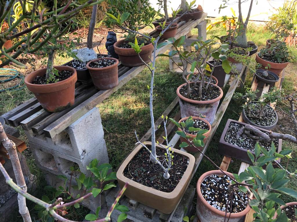 Getting ready for another winter nap. I used to bring these trees inside for the winter and store them without watering until they started budding again in spring. Lately I have been leaving them outside all winter except for the coldest nights (low 40s F) and during rainstorms (still no winter watering).