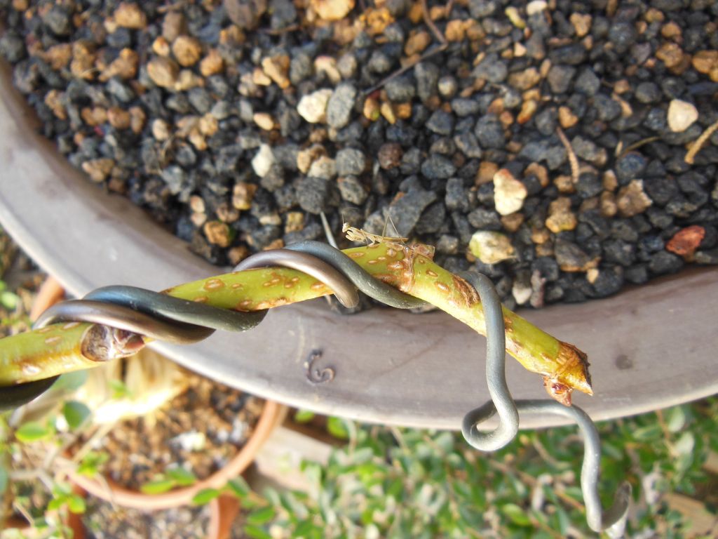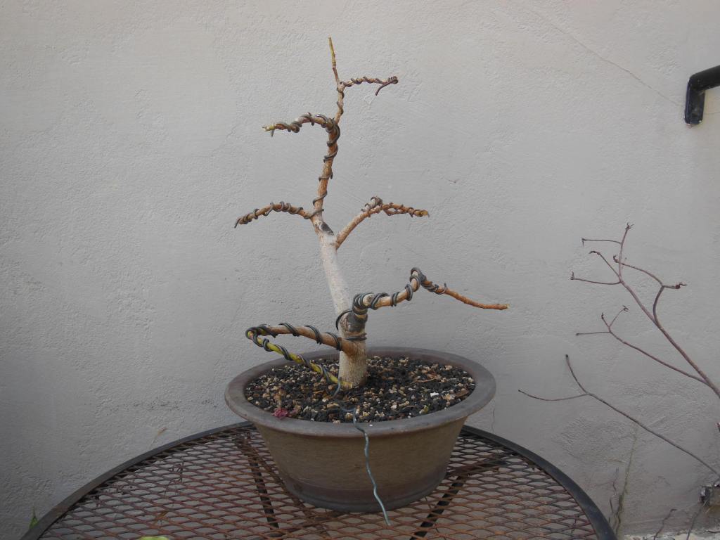 The tree a year later with branches wired. I struggled with trying to reduce the length of these branches. In the future I may rely more on pruning to the first secondary branch on each primary branch to reduce branch lengths instead of trying to do it with wiring.