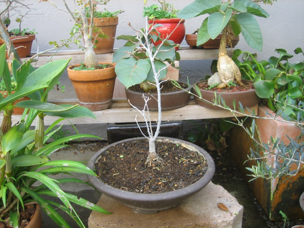 The tree now, with a sacrifice branch developing at the top. The current front is at a different angle than shown here (see below for current front), but I am probably going to change the front of the tree to the view shown in this photo the next time I repot it.
