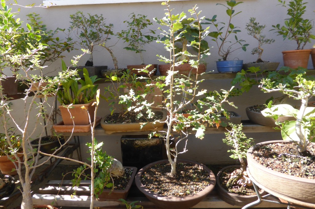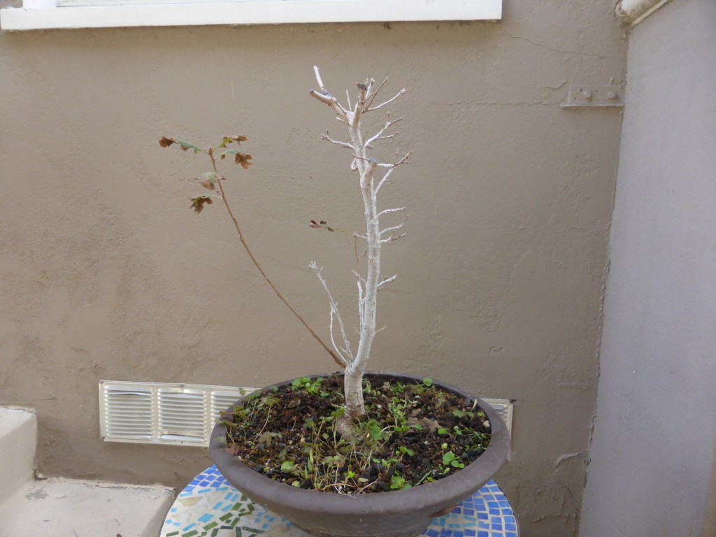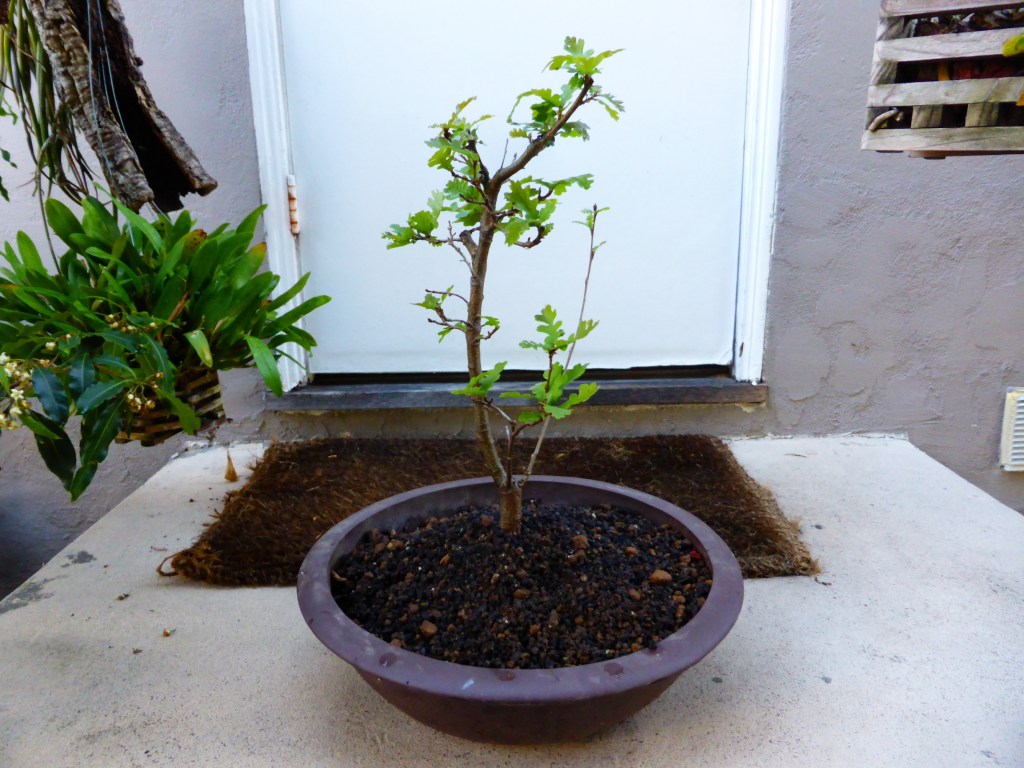 Repotting. I should have pruned the roots shorter at this point, but I was worried having read that oaks are very sensitive to root-pruning. I also didn’t notice that a ball was forming at the base. I should have addressed that by cutting thin wedges between the roots.