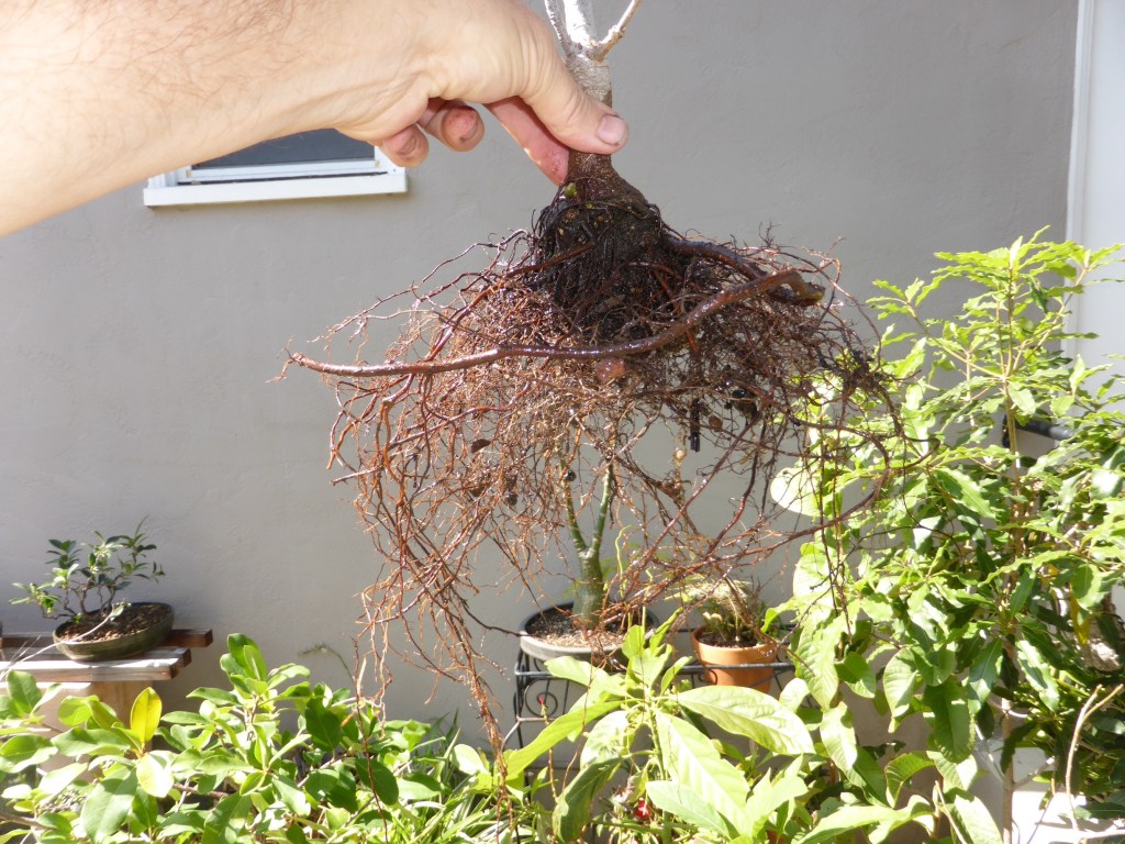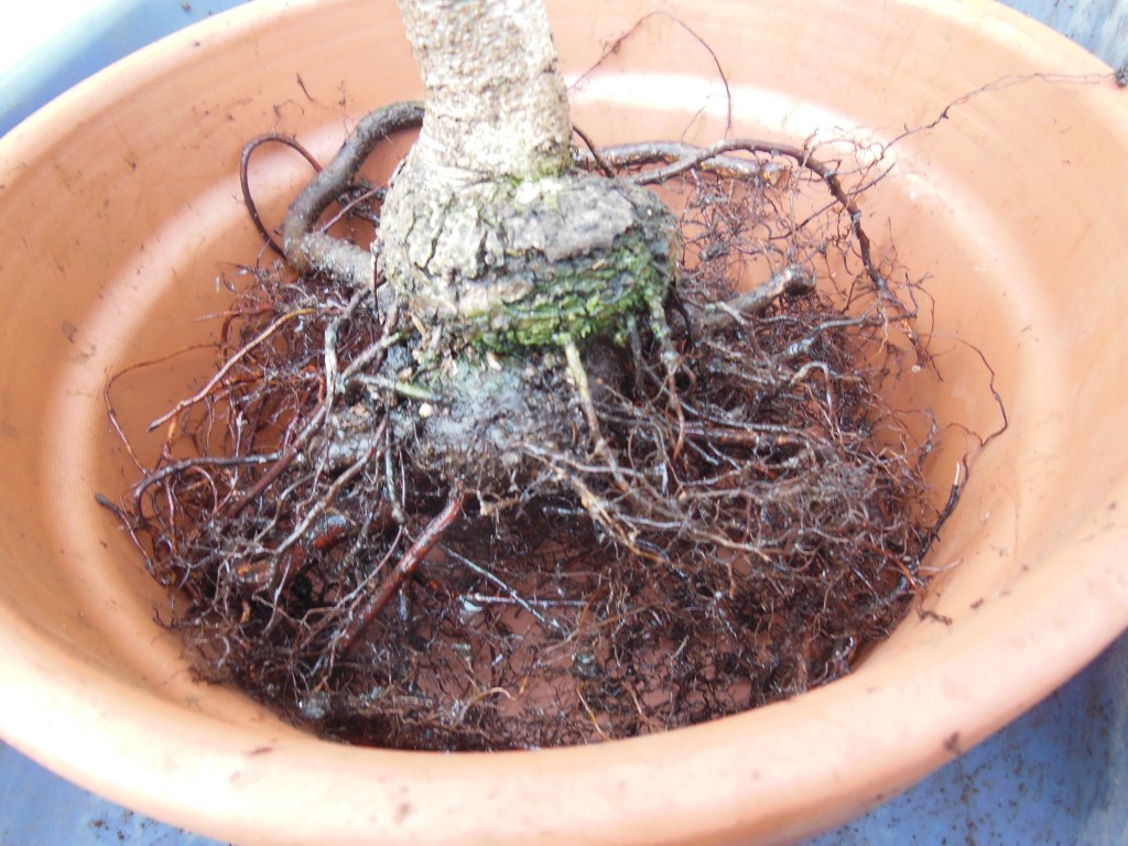 Repotted. Horrible root base. Again, I should have worked more on the roots, at least cutting off the largest ones. I probably could have cut off all the roots at the top layer.