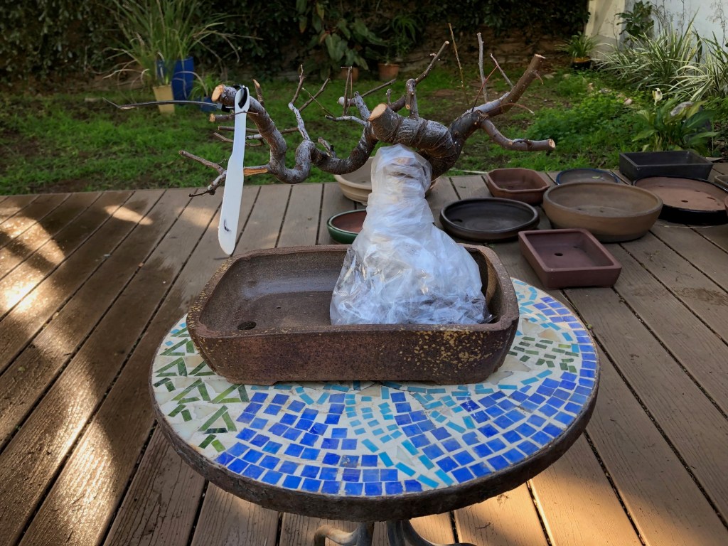 The tree upon arrival. I tested it out with different pots and decided on this one.