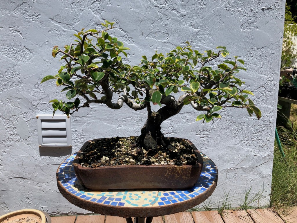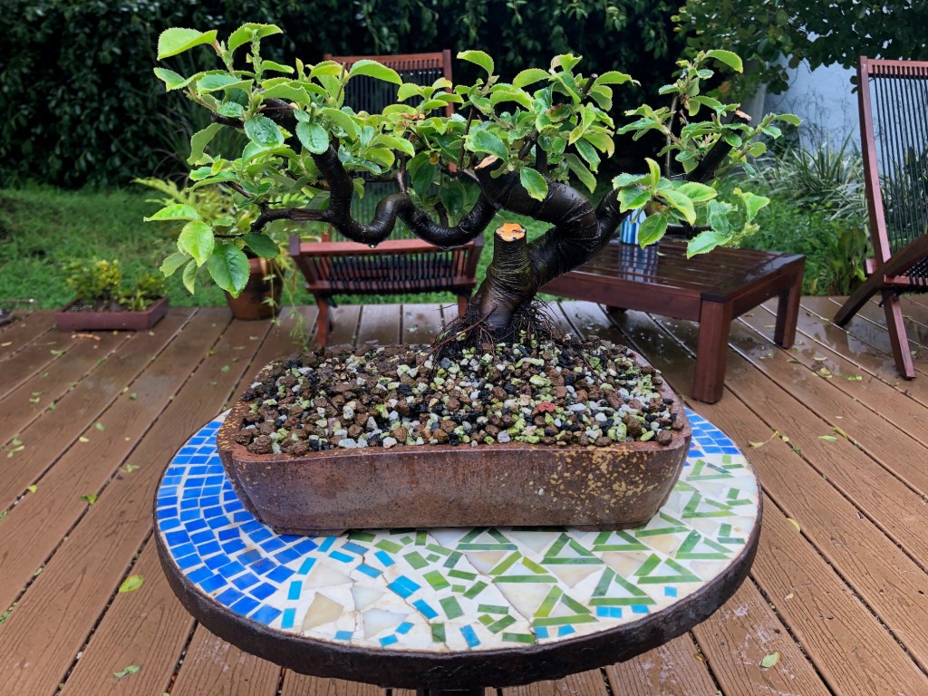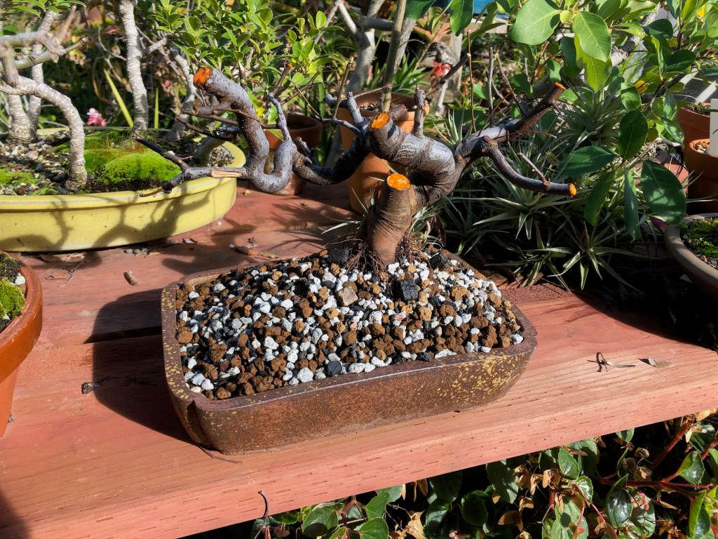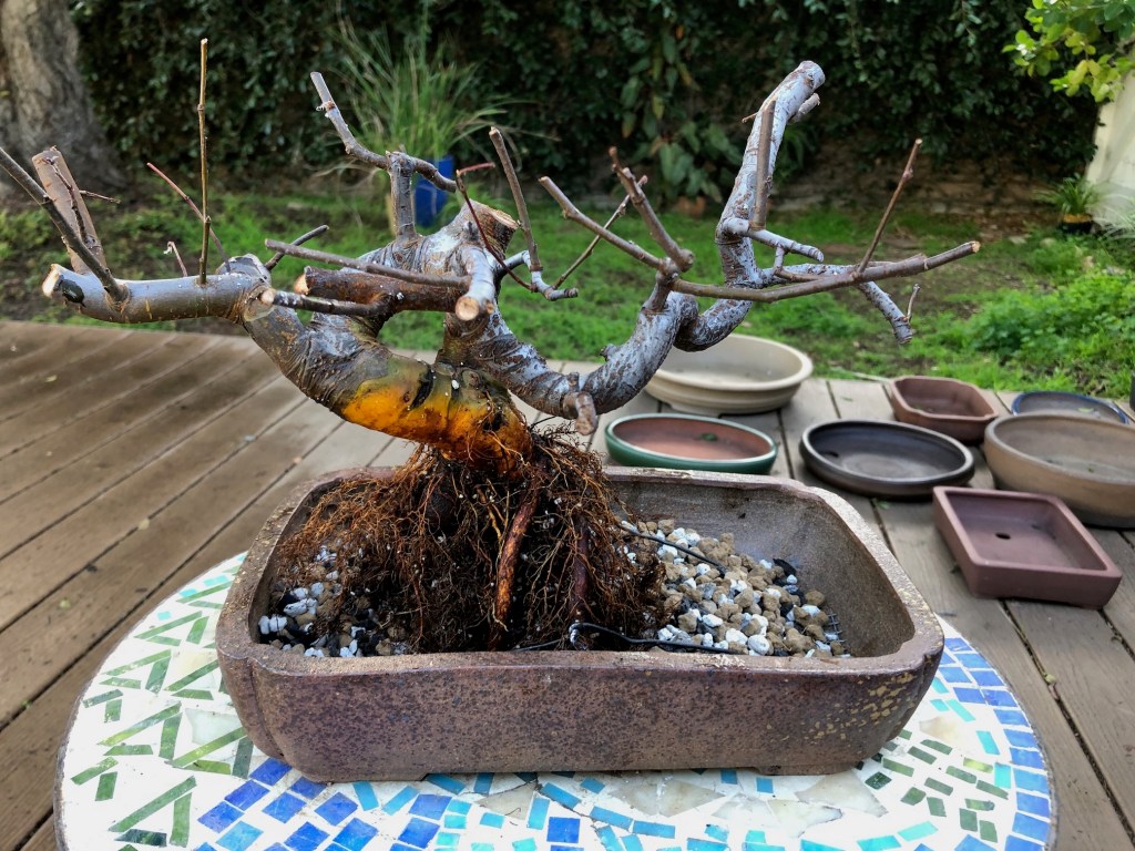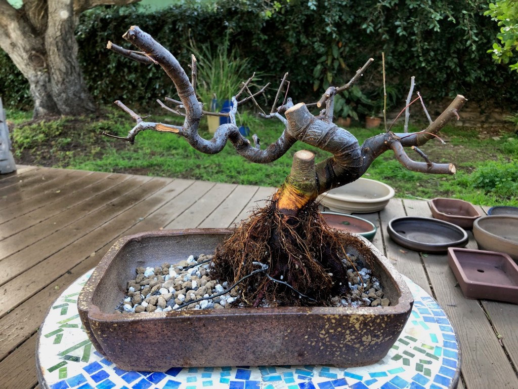 The tree is high in the pot but I decided to mound soil around the exposed roots.