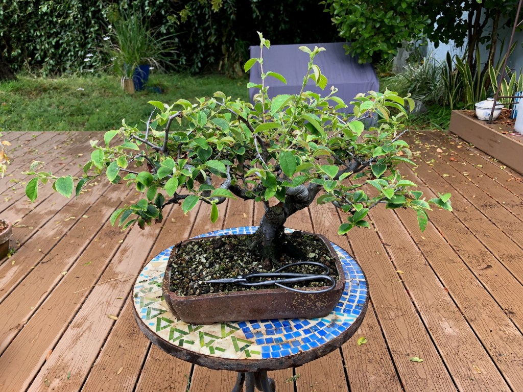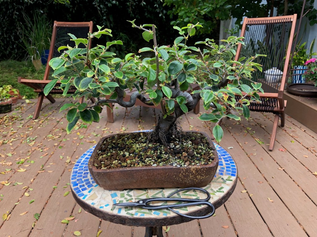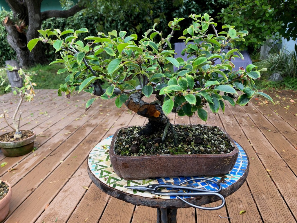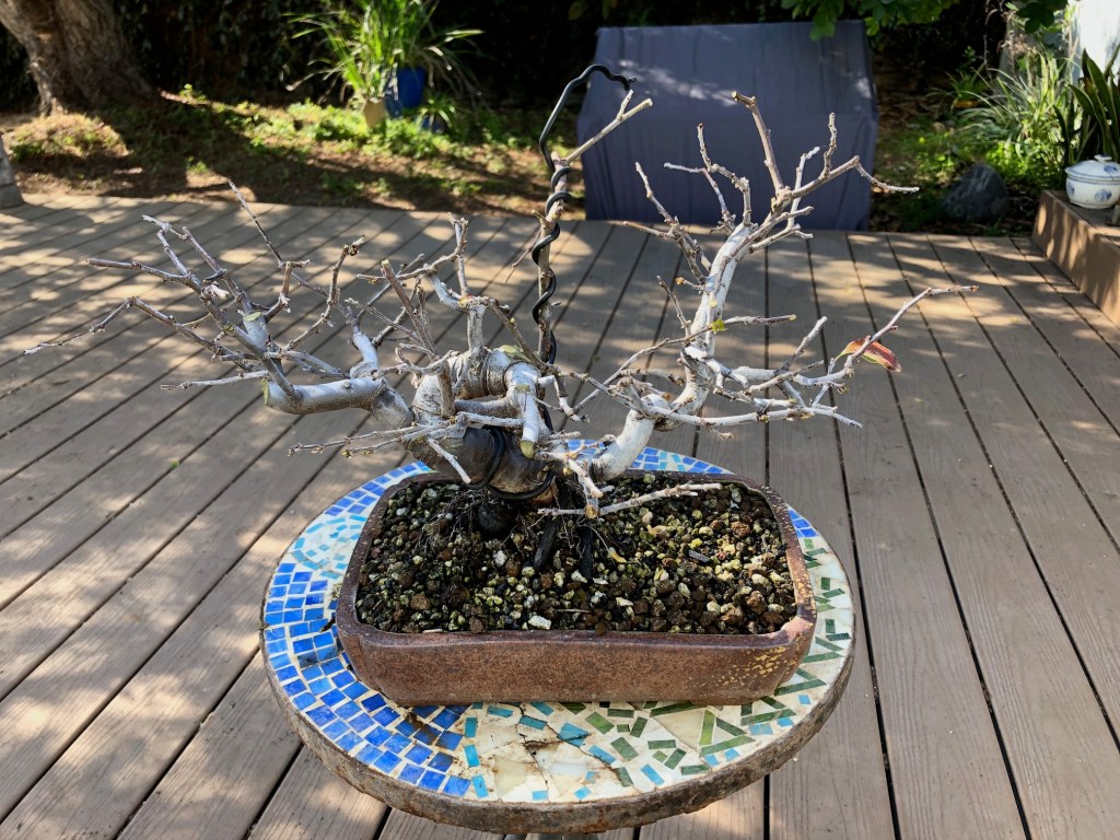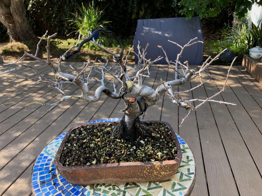 Third pruning of the season. I wasn’t sure what to do with the vertical trunk growing out of the lower stump. It is too straight for the rest of the design. I left it as a sacrifice branch to help close the old stump wound.