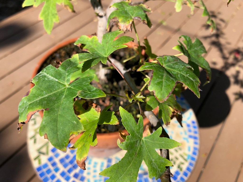 10 days after arrival the tree started developing fungal spots. I contacted Brent at Evergreen Gardenworks and he suggested they were likely because I was keeping it on the ground. His garden doesn’t have an issue with it. He recommended treating with a copper-based fungicide. I did, and the tree recovered. I keep it off the ground now.