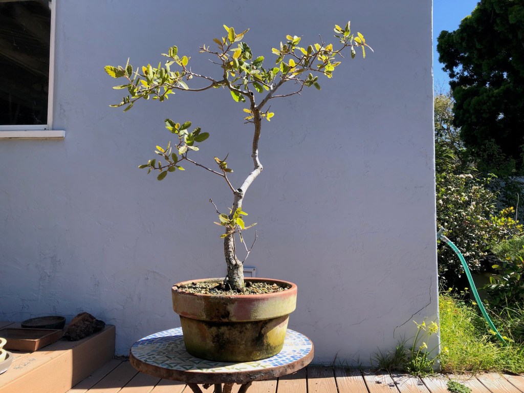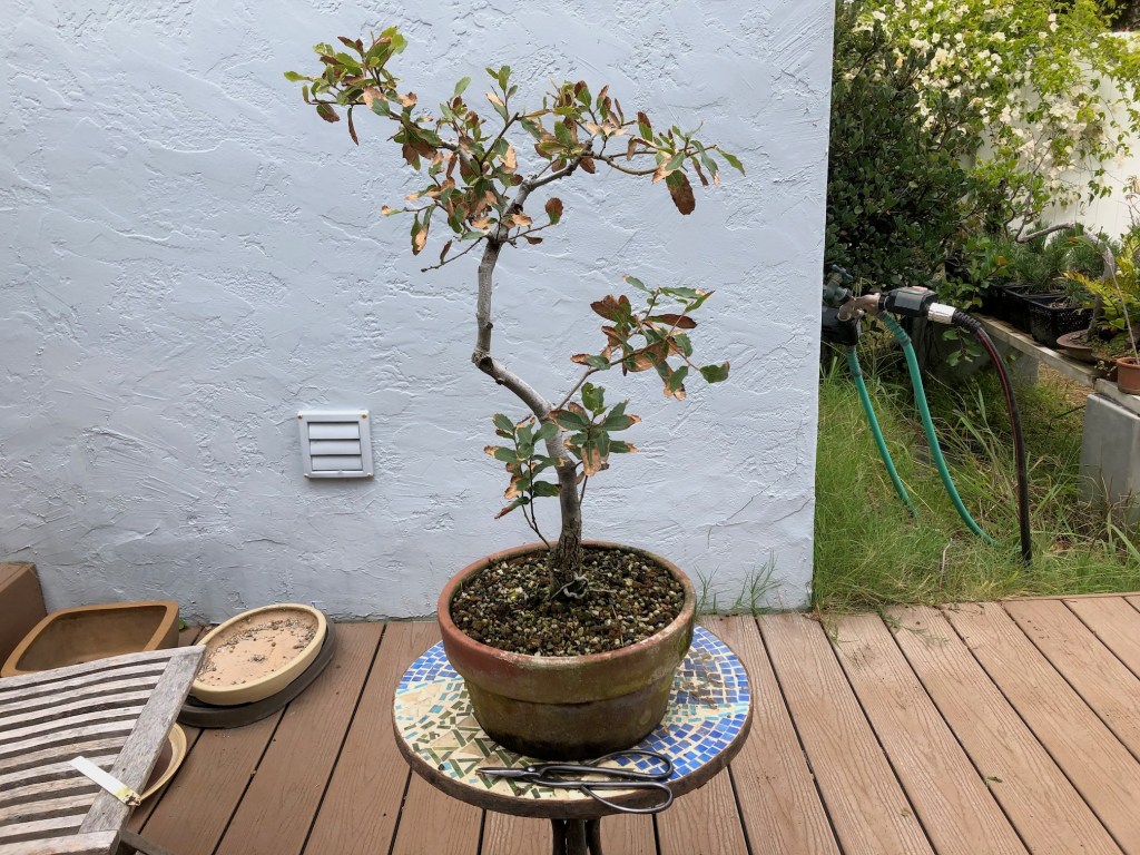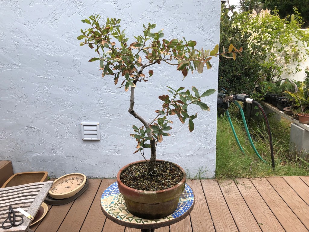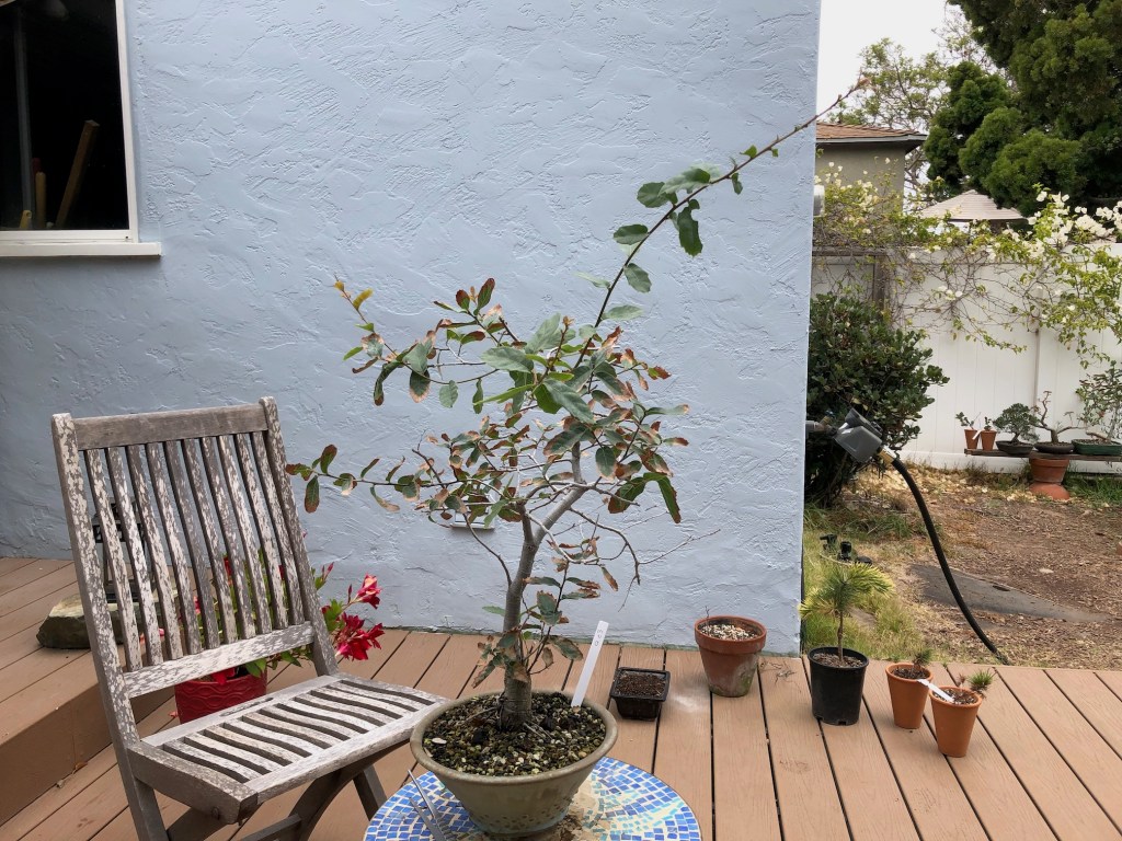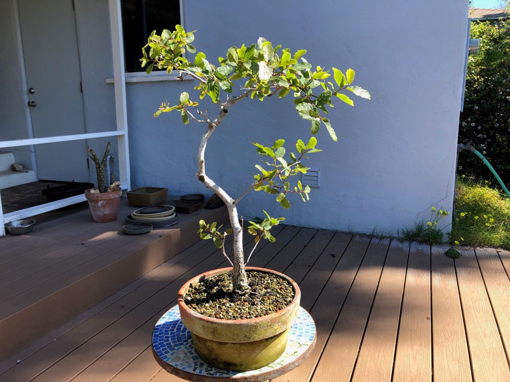 I bought this oak from the California Botanic Garden in Claremont, California on December 28, 2019. For a history of its development from then until April, 2022, see https://beginbonsai.net/2022/04/23/engelmann-oak-quercus-engelmannii/.