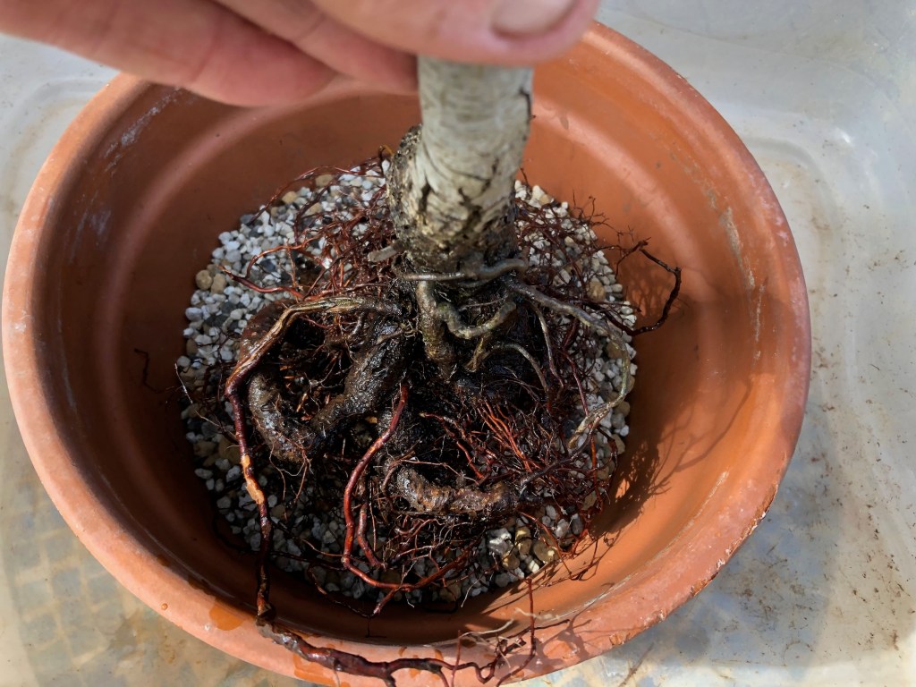 Root-pruned and placed in a larger growing pot.